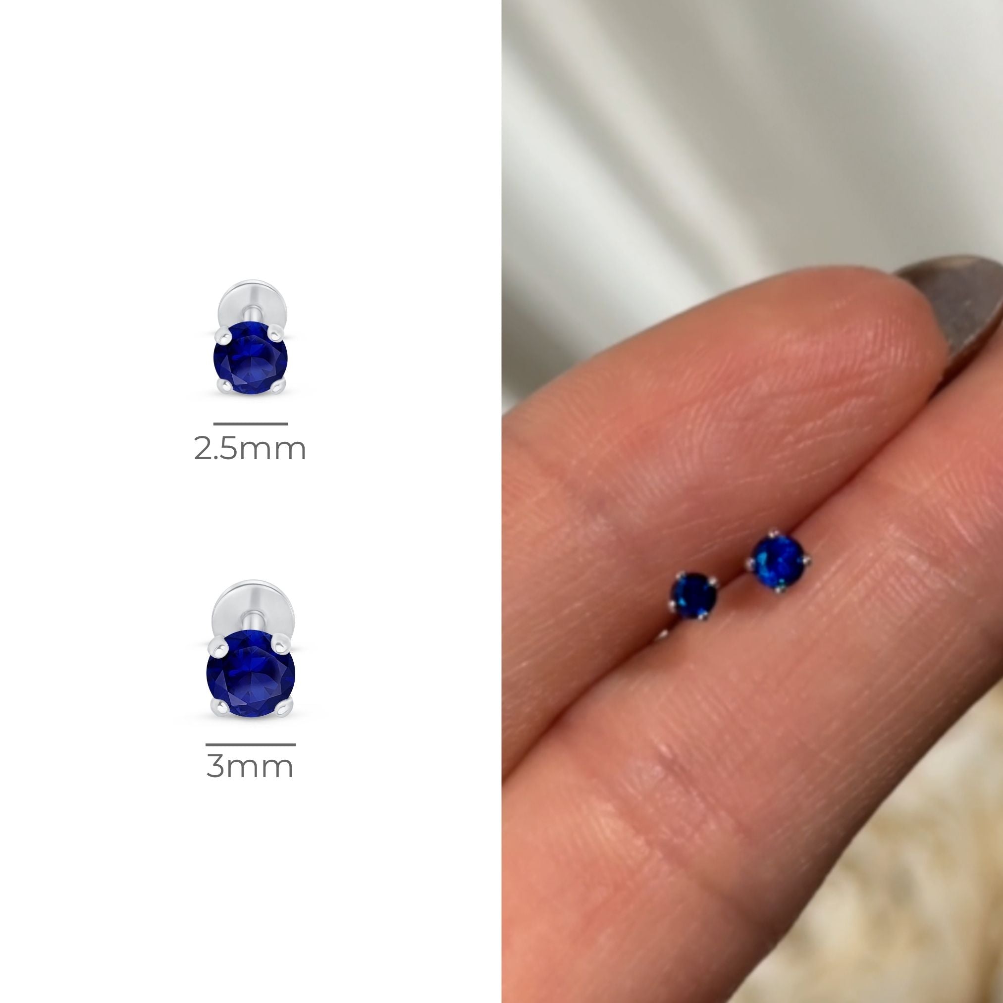 Petite in size and lightweight, these premium 14k gold blue created Sapphire piercing stud earrings are the perfect selection for adding a little bling that is chic for your brand-new ear curation! Designed in a high-quality, bright, polished finish, these hypoallergenic, non-irritating created Sapphire piercing studs are suitable for a variety of differently placed ear piercings placed on the ear. The smooth finish and touch of sparkle are perfect for all your different wardrobe changes and add a contemporary detail that is a fashion-forward statement for your pierced ears. Glittering round blue created sapphire that are securely prong set on the front and will not snag on your clothing.