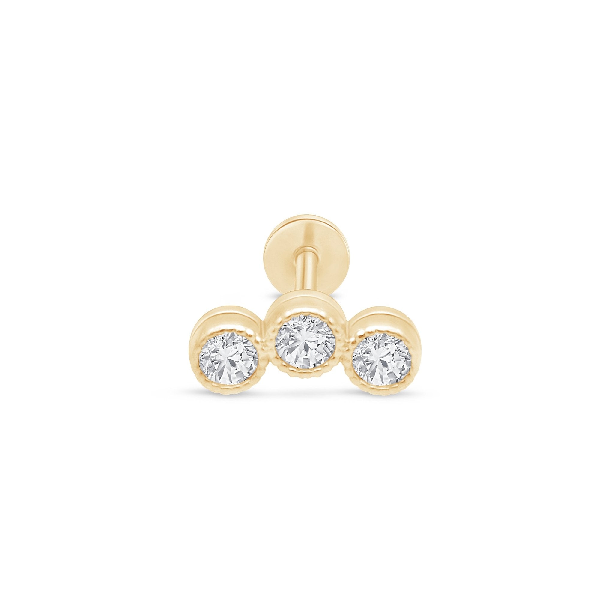 Triple Gemstone Milgrain Flat Back Stud Earrings in Solid 14k Yellow Gold