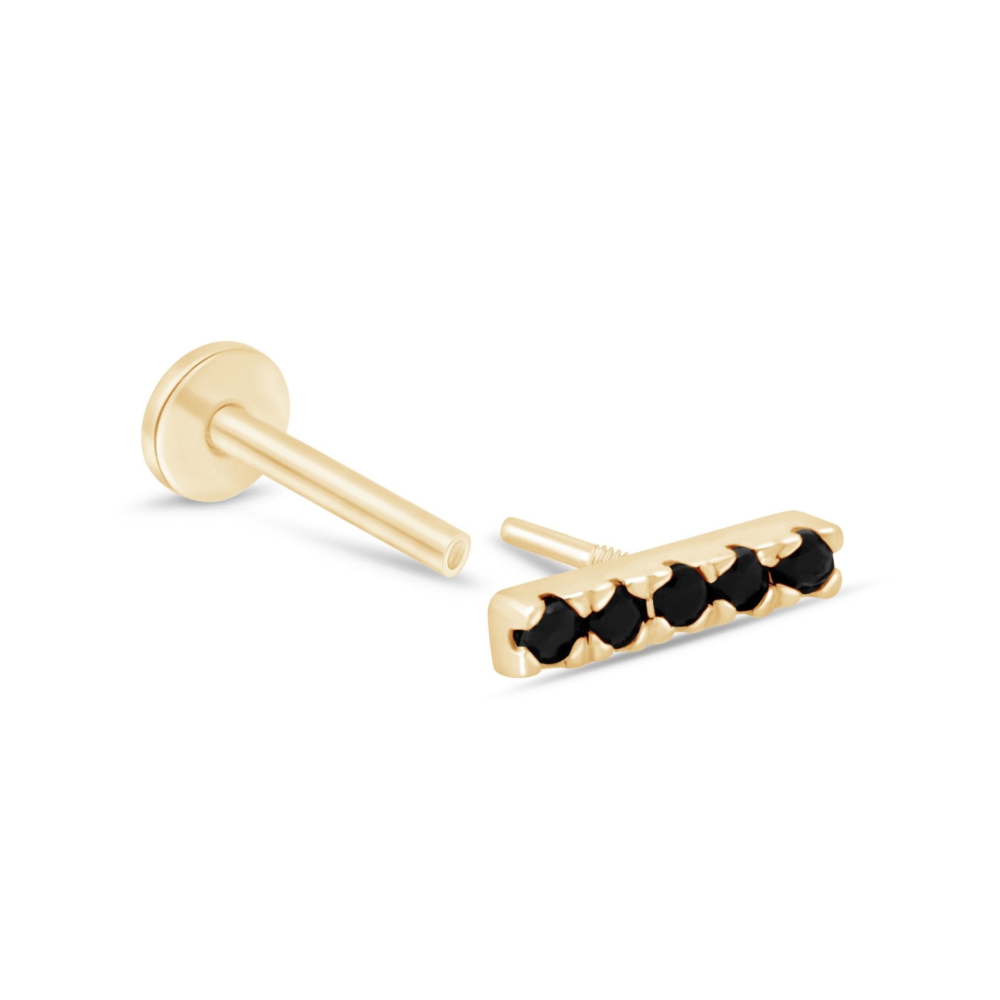 Created in a bright shine finish, these black onyx studded bar stud earrings have a punk rock vibe that is the perfect look for your ear piercing! Designed in 14k gold in a bright polish, These gold piercing studs are perfect for everyday wear. Mix and match this super-glam stud with other hoops and studs for a different look each time.