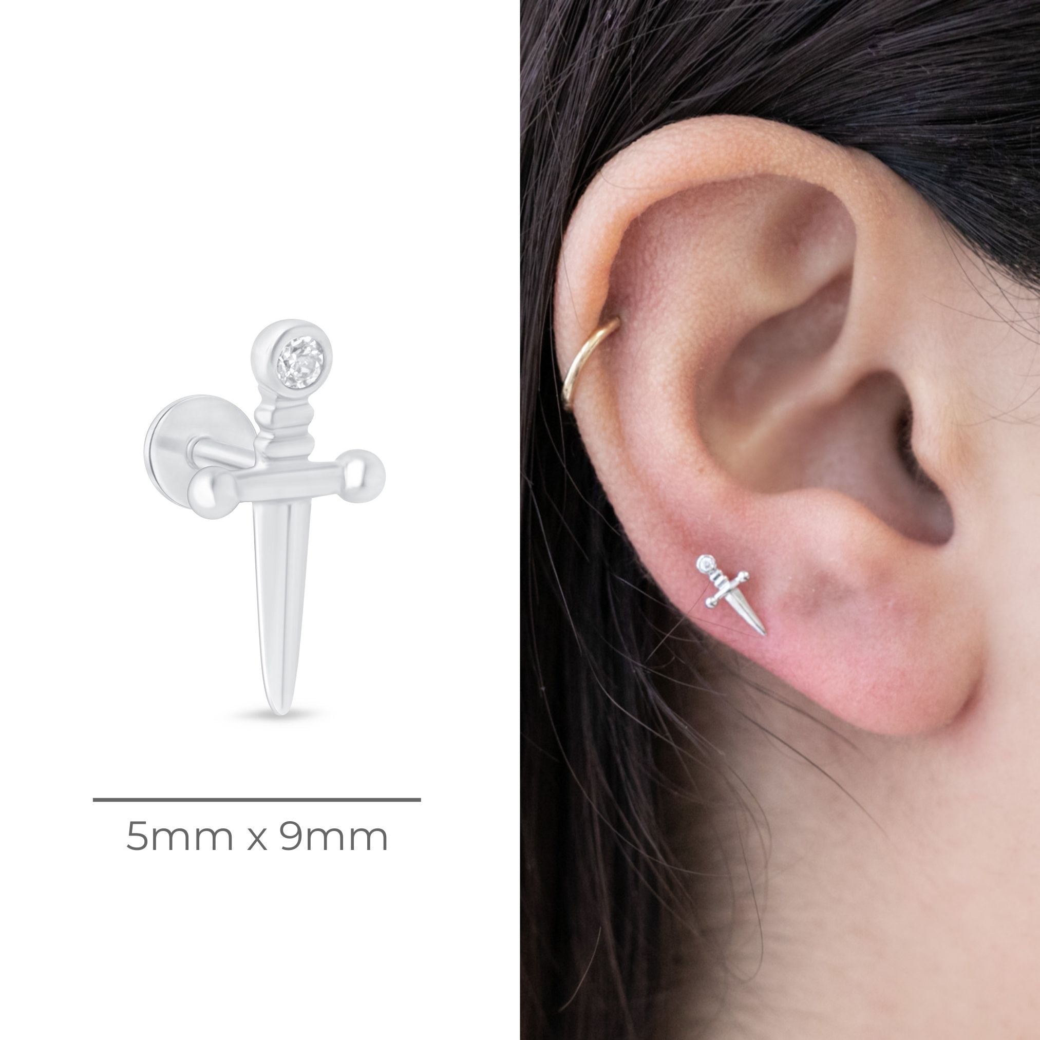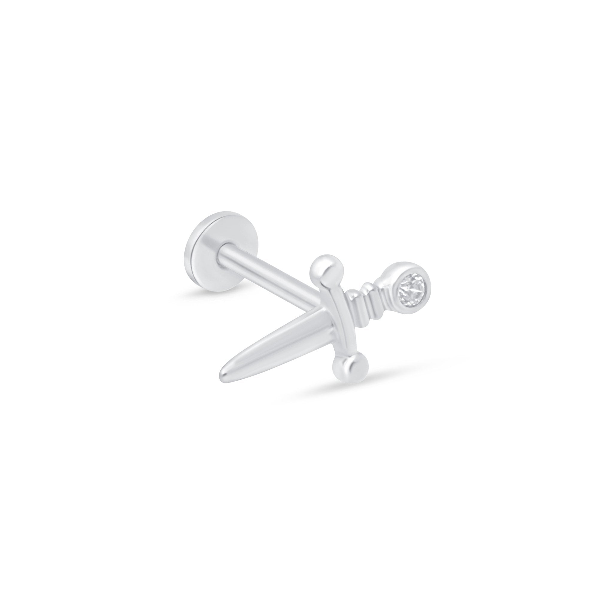 Look fierce yet stylish in these dagger cartilage studs. Designed in brightly polished solid 14k gold, these cartilage studs are easy to mix and match with other earrings. This sleek dagger features a cubic zirconia adorned hilt. A symbol of protection, this dagger cartilage earring adds ferocity to your ear stack.