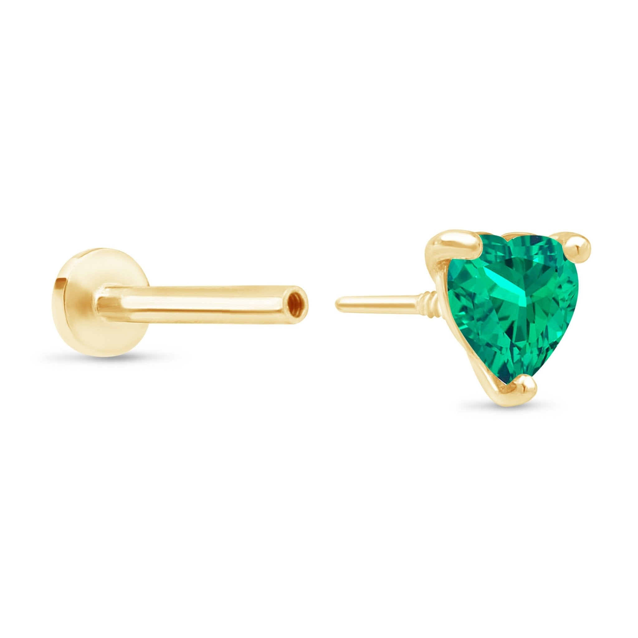 These earrings feature petite heart-shaped emeralds that add sparkle with a vibrant pop of green. Perfect for new piercings and sensitive skin, these earrings have threaded flat backs available in 4 sizes, ensuring comfortable wear day or night. Whether as a gift for a loved one or a treat for yourself, these delicate flat back earrings are sure to capture hearts wherever they go.