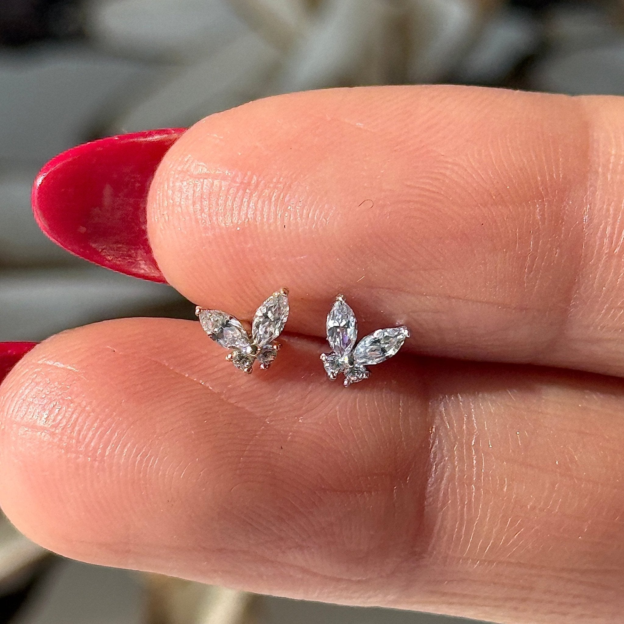 Fluttering Butterfly Flat Back Stud Earrings in Solid 14k White Gold
