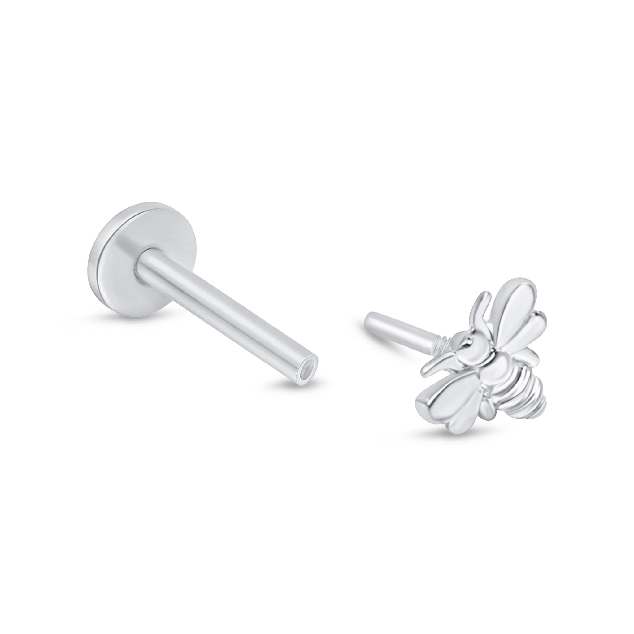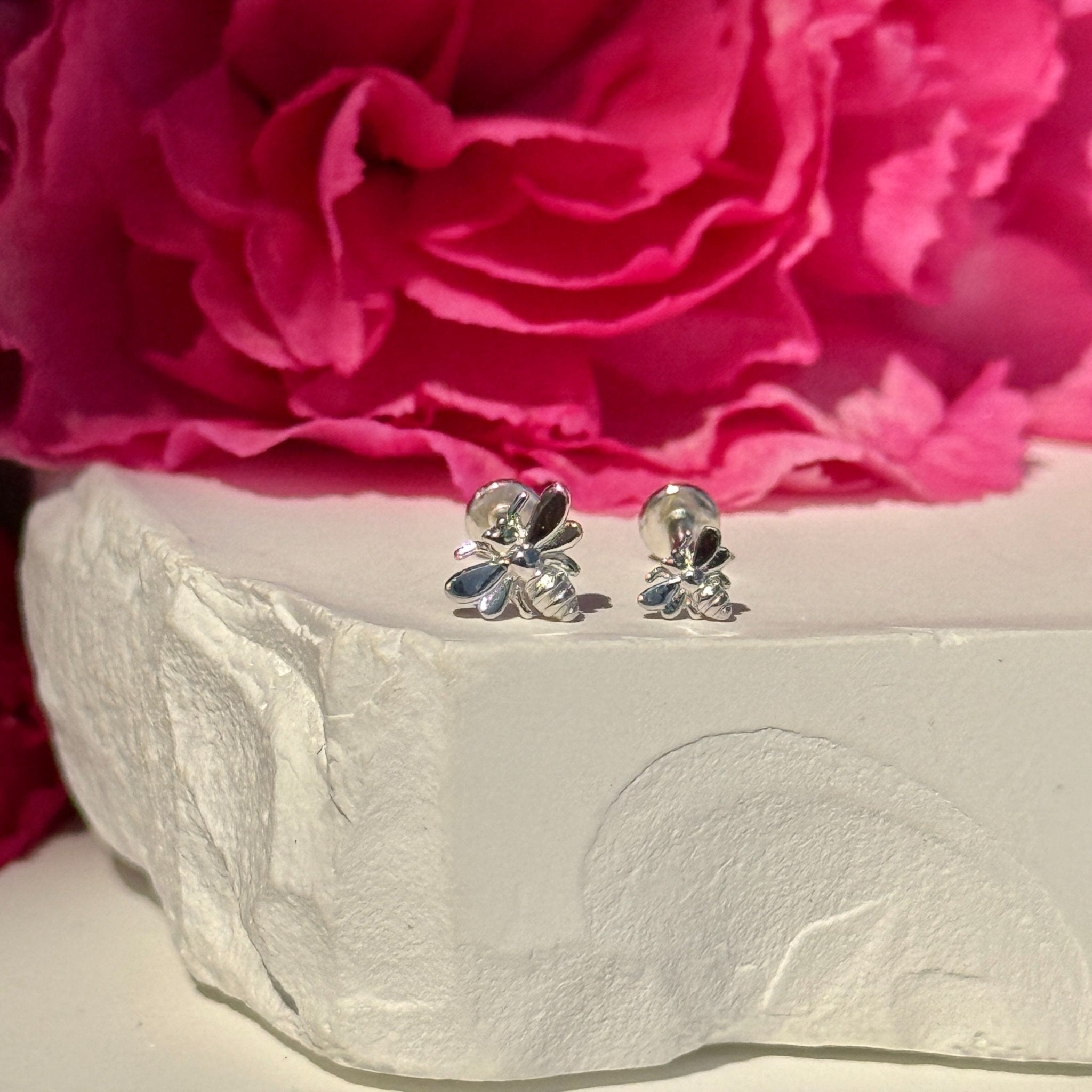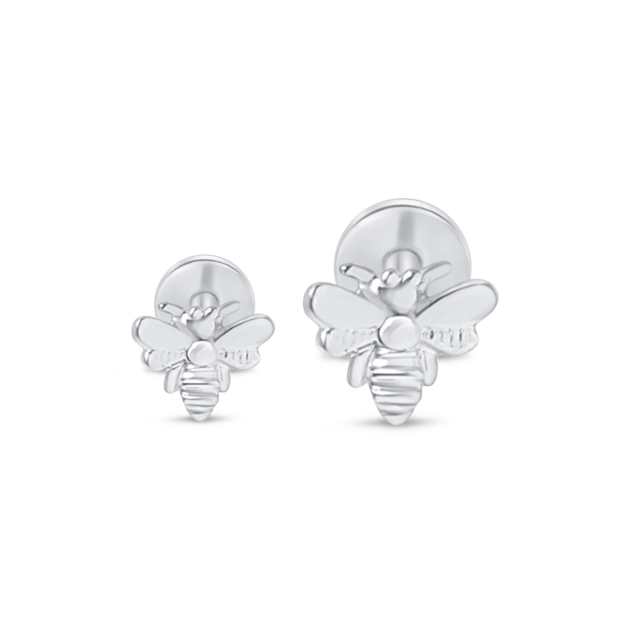 Minimalist Bee Flat Back Stud Earrings in Solid 14k White Gold