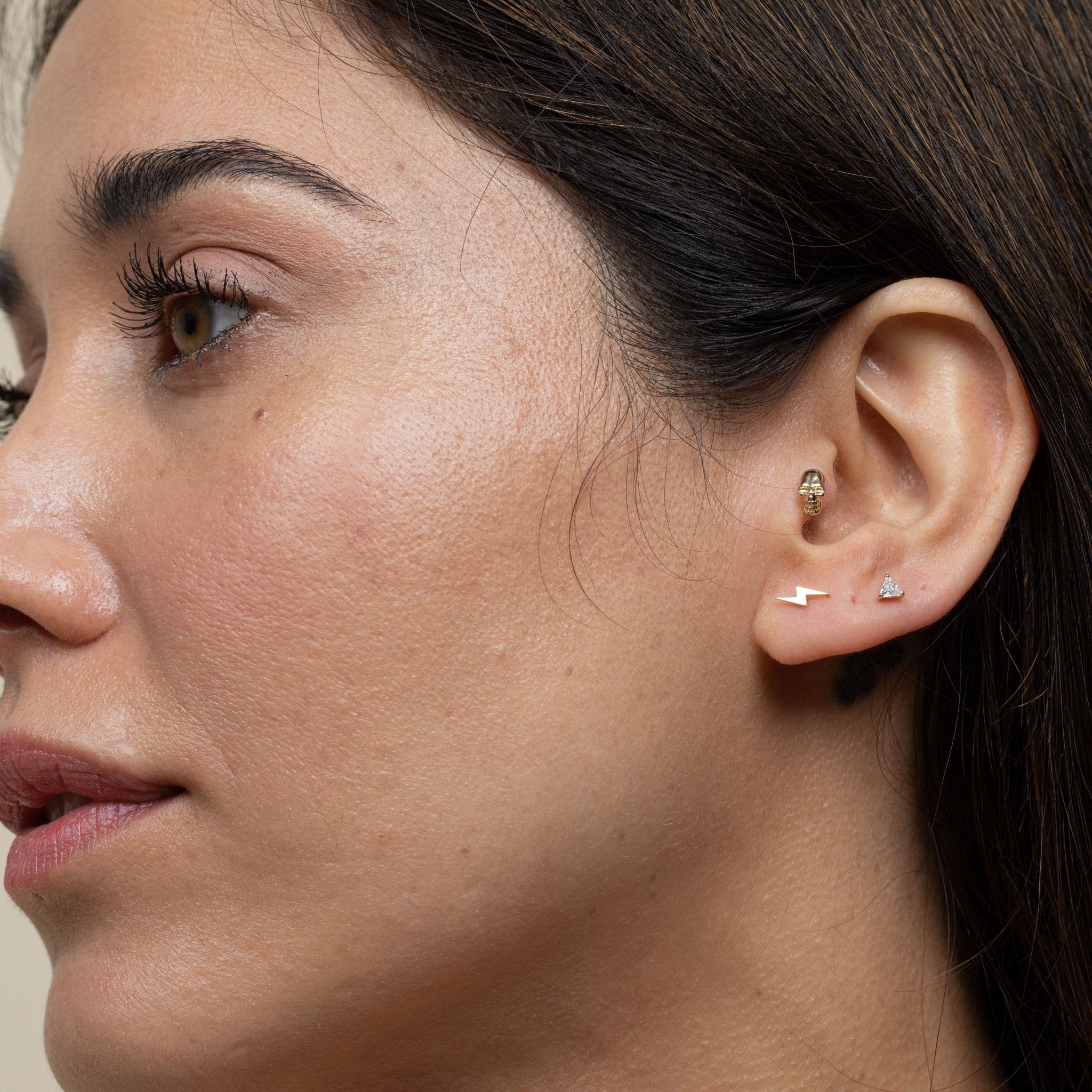 Lightning bolts symbolize inner knowing and illumination, long ago said to come from the gods in the heavens, including the Greek god, Zeus, striking down to earth as a metaphysical, spiritual warning. Lightning bolts are considered lucky omens, such as being €œstruck by lightning€ of good fortune and prosperity. Either way, these high-quality 14k gold lightning bolt piercing studs are an eye-catching, stylish selection for those who seek a unique look for their freshest ear piercing. Hypoallergenic and non-irritating, these premium 14k gold lightweight, petite gold studs are perfect for your any piercings or can easily be matched with small hoops and studs for neighboring ear holes.