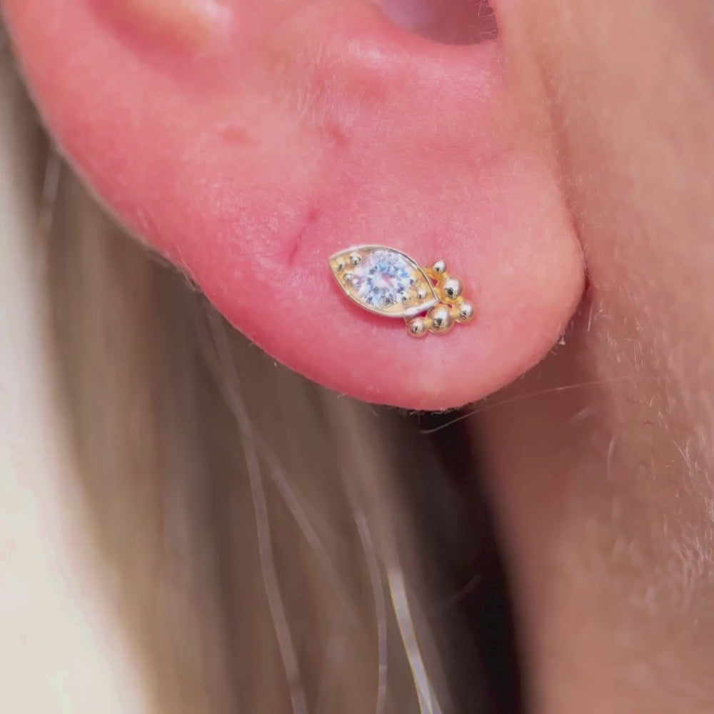 Sleek and refined, this evil eye-inspired marquise stud adds subtle edge to any ear stack. Crafted in 14k solid gold, it features a marquise-cut cubic zirconia framed by delicate beaded detailing. Designed with a threaded 18G post for a snug, secure fit, it’s perfect for helix, cartilage, tragus, or lobe piercings. The flat back can be tailored to your ear with our range of back length options, ensuring all-day comfort. Hypoallergenic and available in yellow or white gold, this minimalist stud shines whether worn solo or styled with others.
