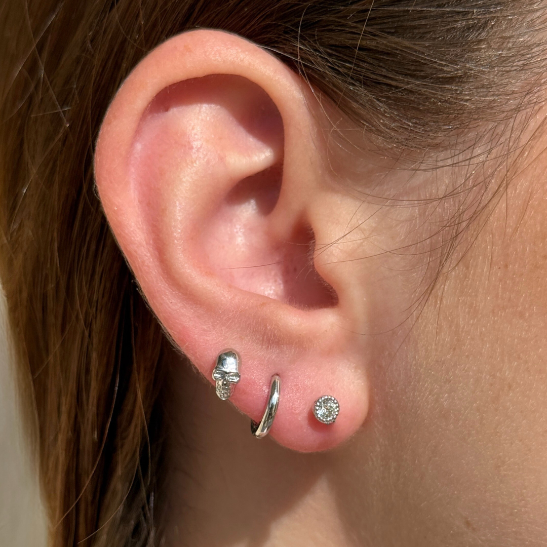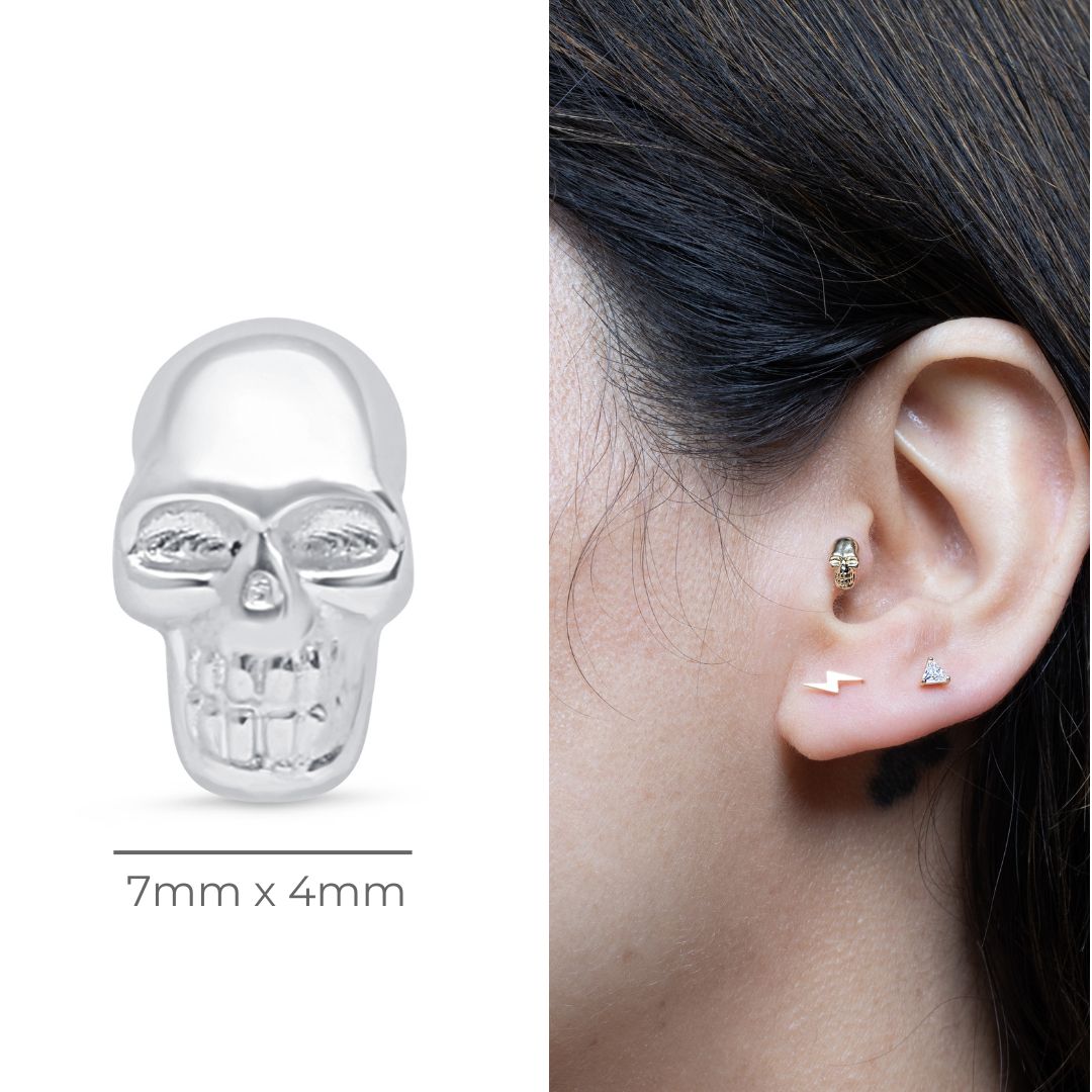 These white gold skull stud earrings are designed in brightly polished 14k white gold and perfect to give your ear stack an edge.