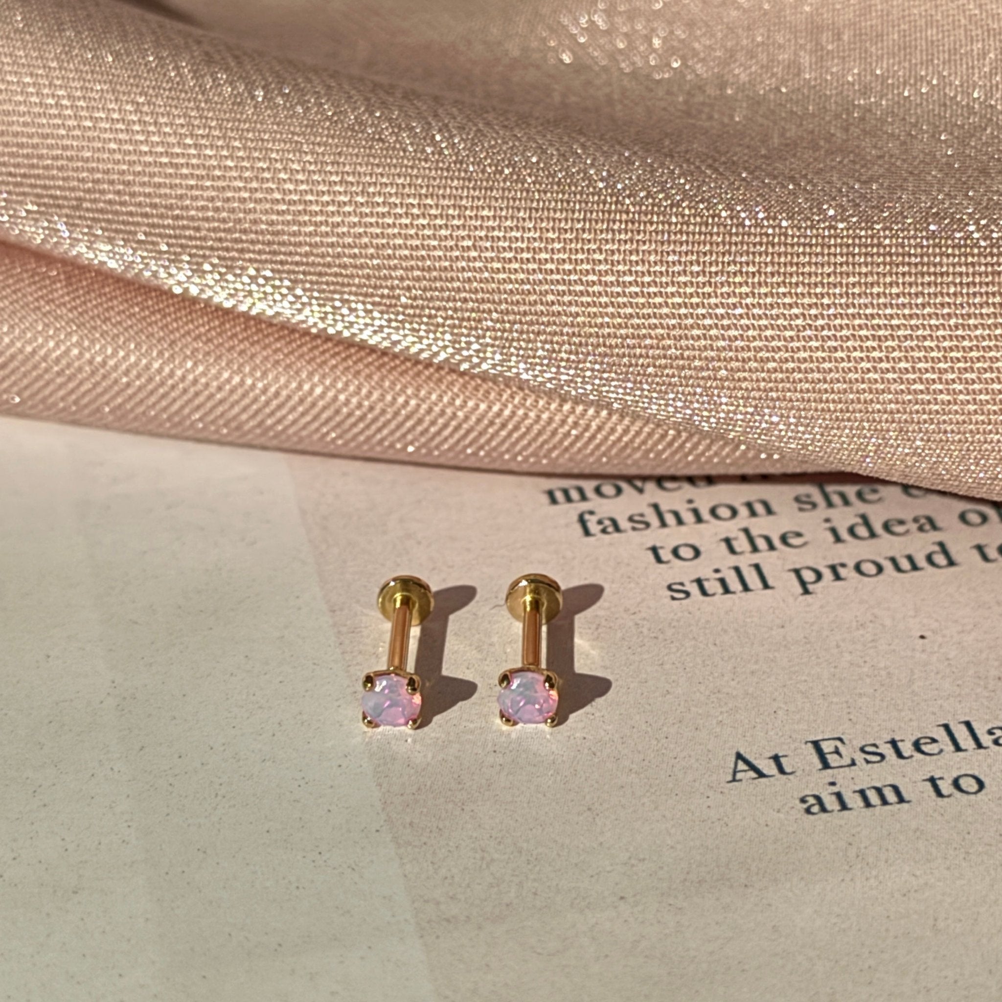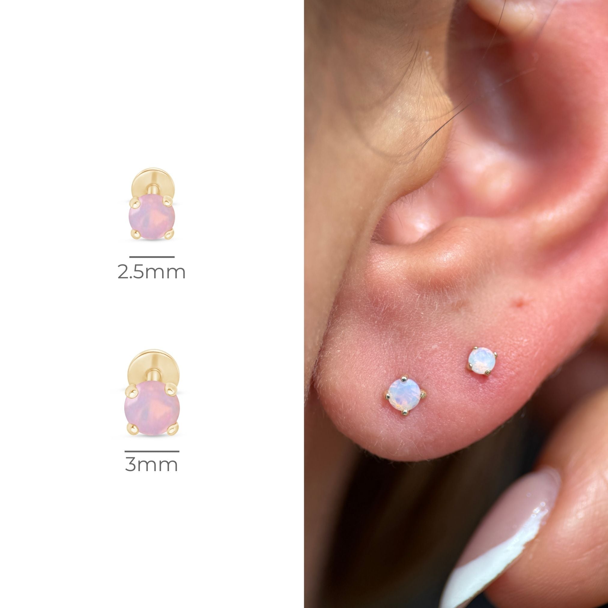 Pink Opal Cartilage Flat Back Stud Earrings in Solid 14k Yellow Gold