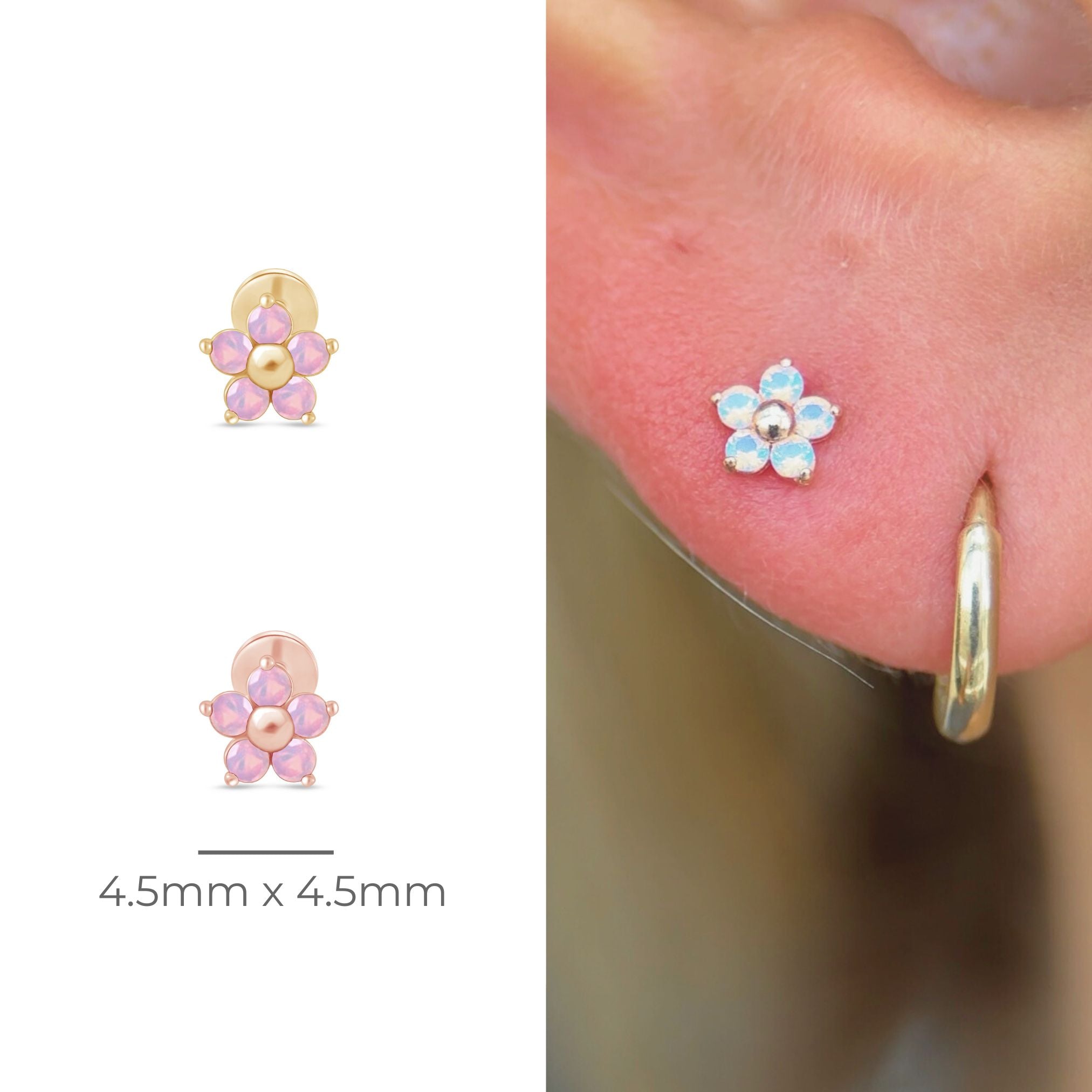 These dainty created Opal flower studs will remind you of Spring's first blooms. These earrings are made in hypoallergenic solid 14k gold perfect for frequent wear and all occasions.