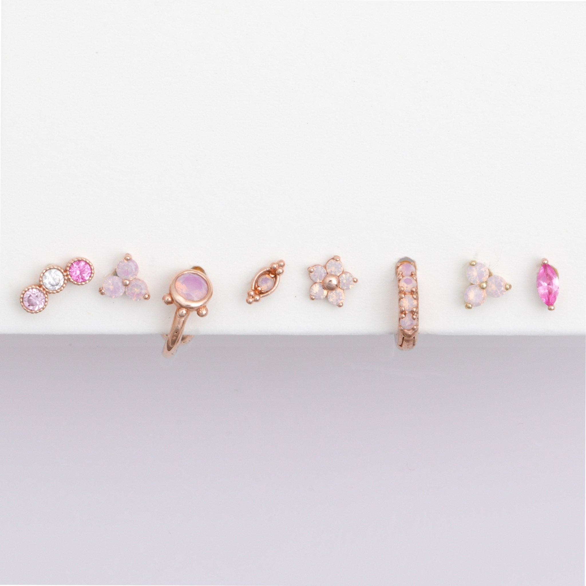 Pink Opal Trinity Cluster Flat Back Stud Earrings in Solid 14k Yellow Gold