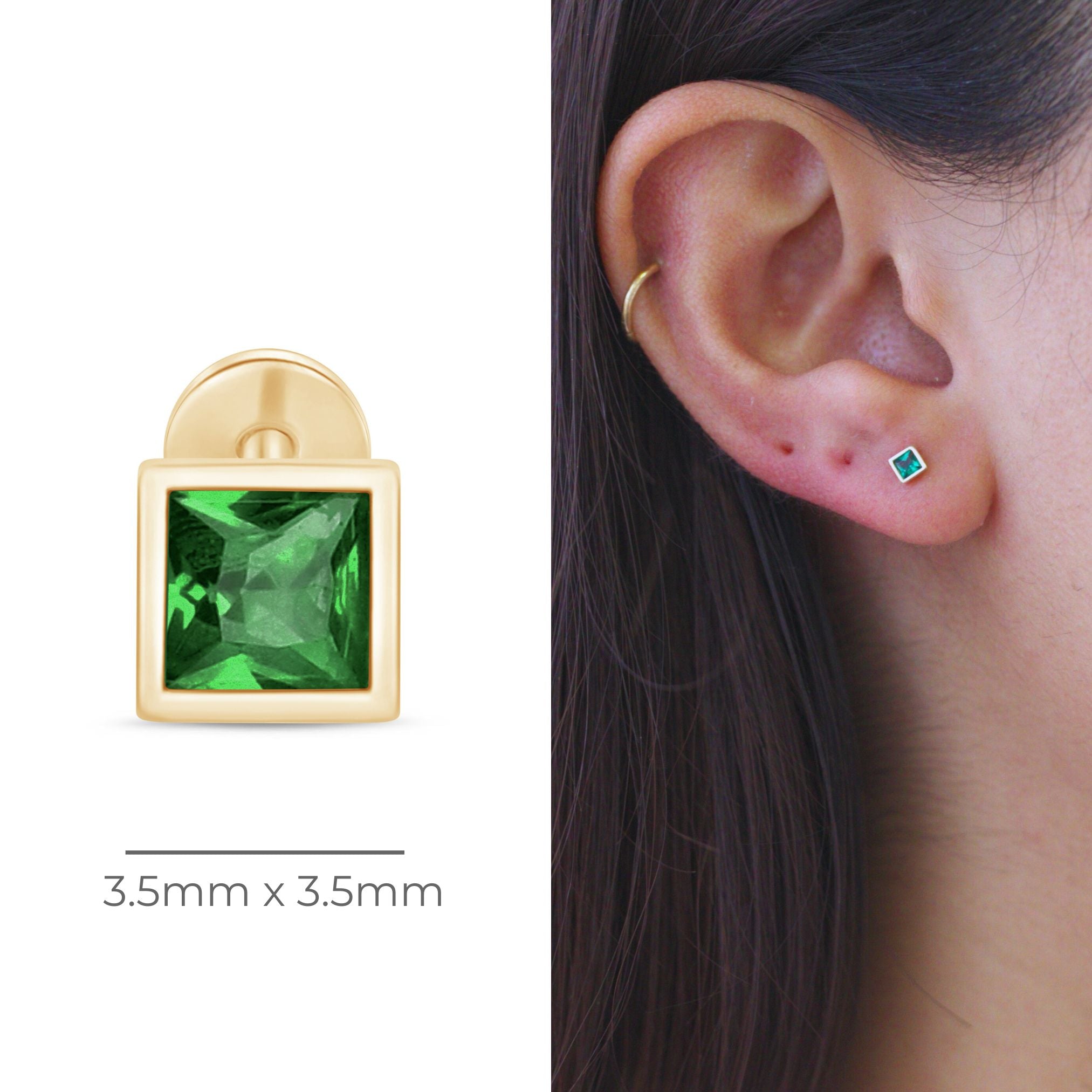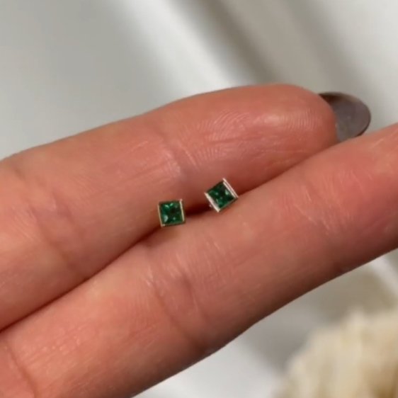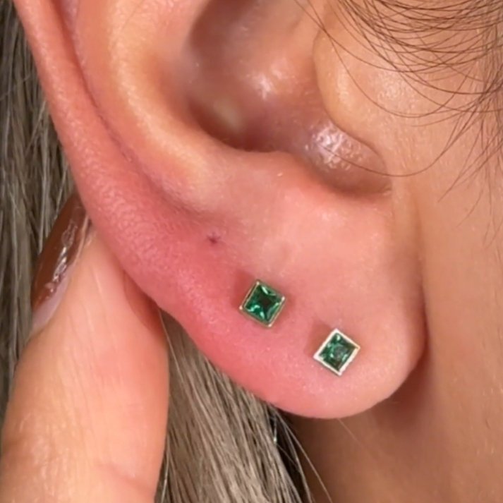 These square princess cut created Emerald studs give your outfit a beautiful pop of green. The delicate gold bezel catches the light and adds shine factor. Created in brightly polished solid 14k yellow or white gold, these lightweight and hypoallergenic flat back earrings are perfect for everyday wear.