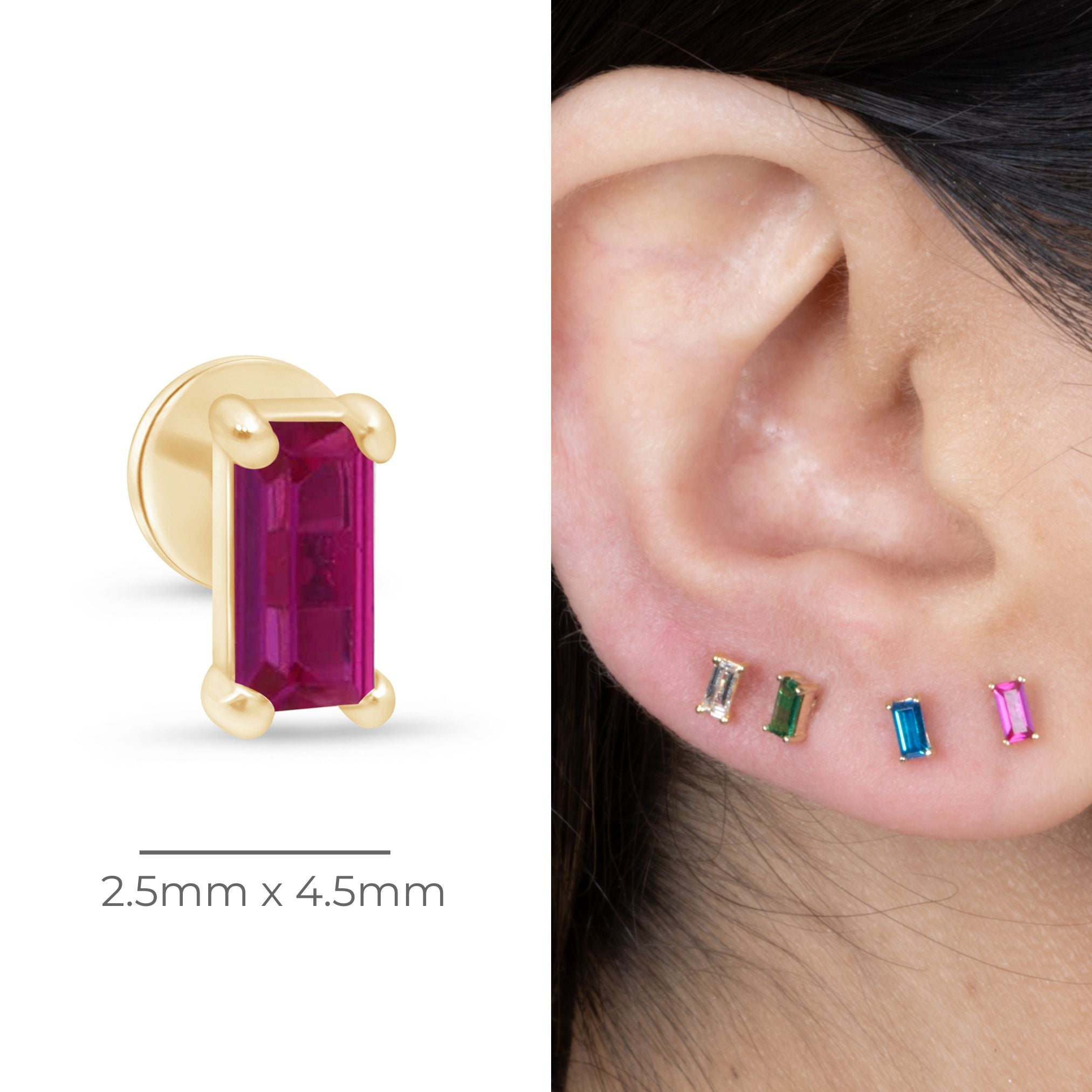 With a touch of sparkle and a unique vibrant hot pink hue, these beautiful baguette created Ruby Flat Back Studs are the perfect way to add some color to your everyday attire. They're also made in solid 14k gold for a sleek finish.