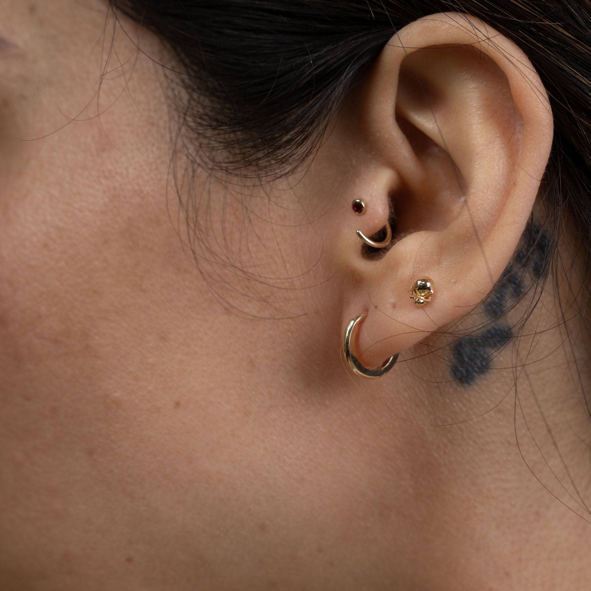 These shiny skull flat back comfort studs add a bit of edge to your ear stack. Designed in brightly polished solid 14k gold, these cartilage studs are easy to mix and match with other earrings. These little skulls are sure to become a staple in your wardrobe, they will add a touch of dark delight to any ensemble.