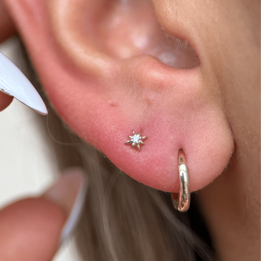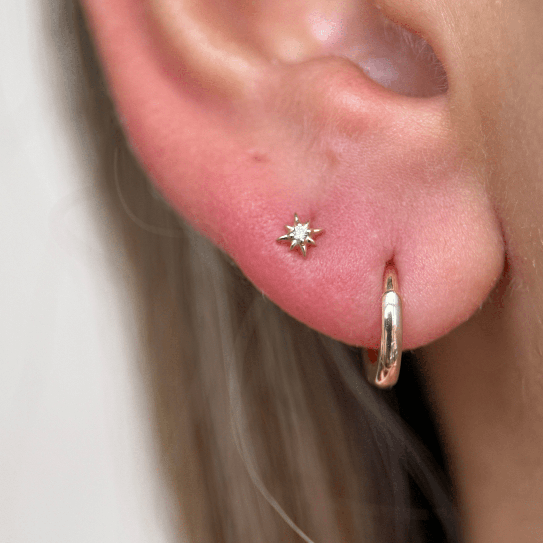 This 14k solid gold North Star earring features a small starburst design with a cubic zirconia center. The threaded flat back ensures a secure and comfortable fit for helix, tragus, cartilage, or lobe piercings. Made from solid gold, it’s suitable for sensitive skin and everyday wear.