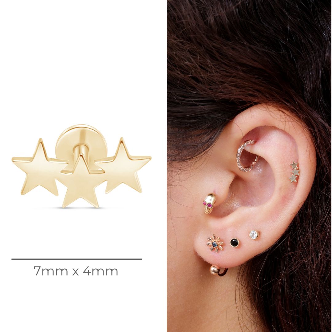 These adorable multi-star Big Dipper constellation gold piercing stud earrings are made in brightly polished 14k Yellow Gold. They are a fantastic selection for your newest ear piercing! Made with three stars in a graceful arc, these high-quality lucky star earrings would look great on a cartilage or lobe piercing with their linear shape. A shiny finish on these petite, non-irritating, hypoallergenic, premium piercing studs creates a striking style that is perfect for showing off. Mix and match these little piercing studs with hoops and studs on neighboring ear holes, if desired. Dainty in size, these bold little piercing studs are unique.