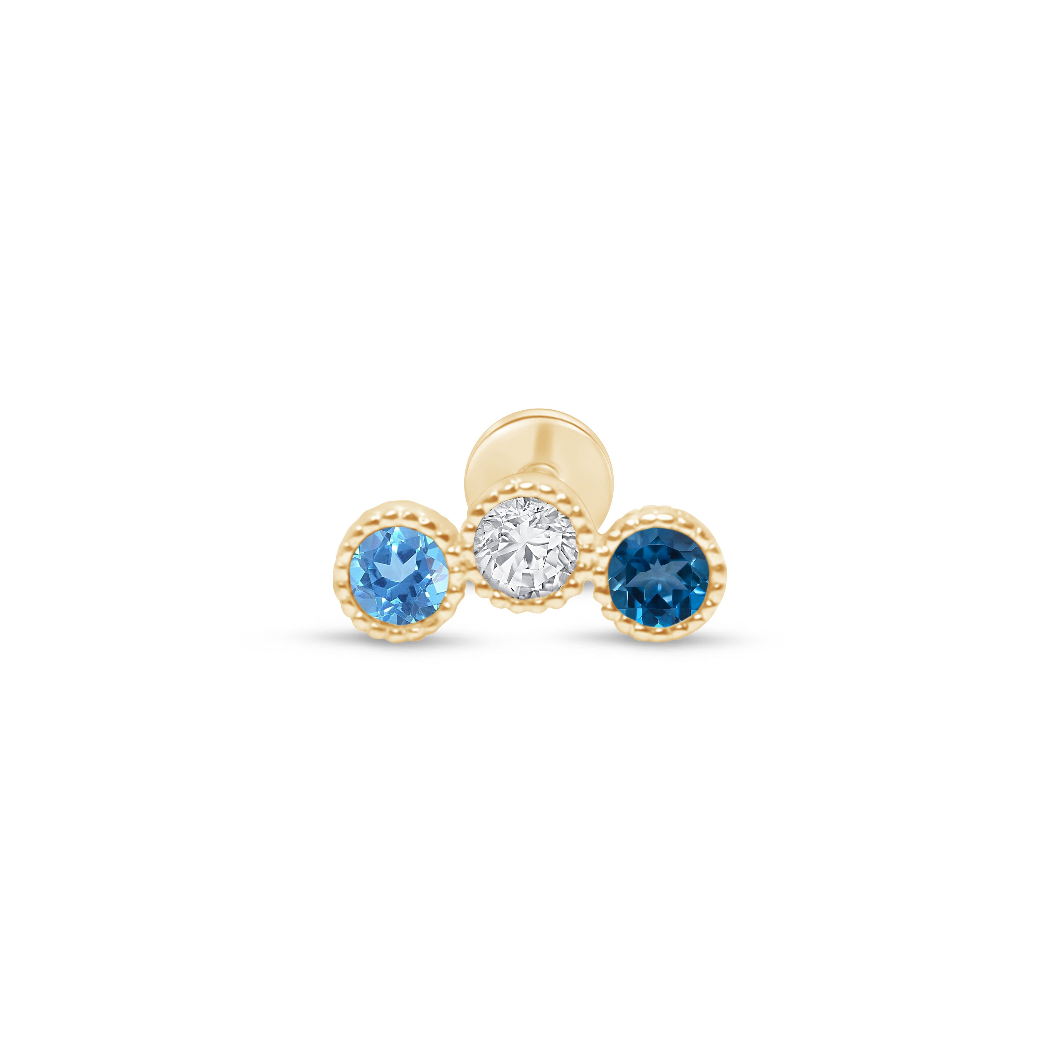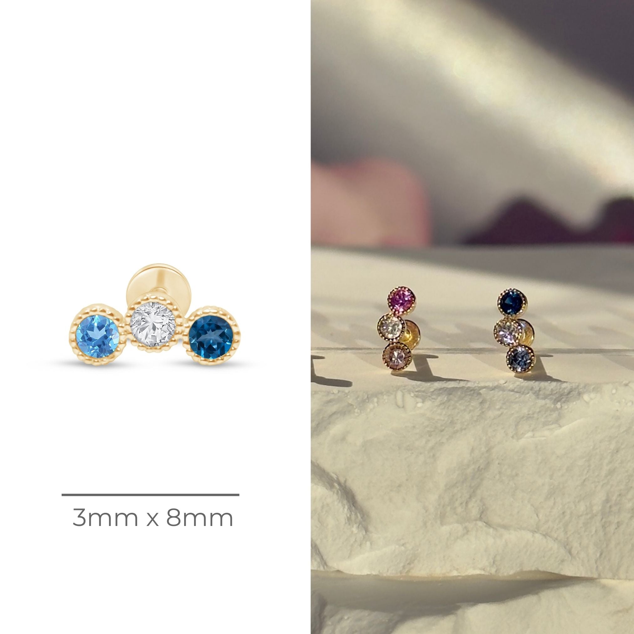 These dainty earrings feature three stones on each stud, sparkling in vibrant blues. Designed in brightly polished 14k solid gold and made with non-irritating, hypoallergenic materials that are soft on the skin, these flat back earrings are perfect for new piercings and everyday comfort.