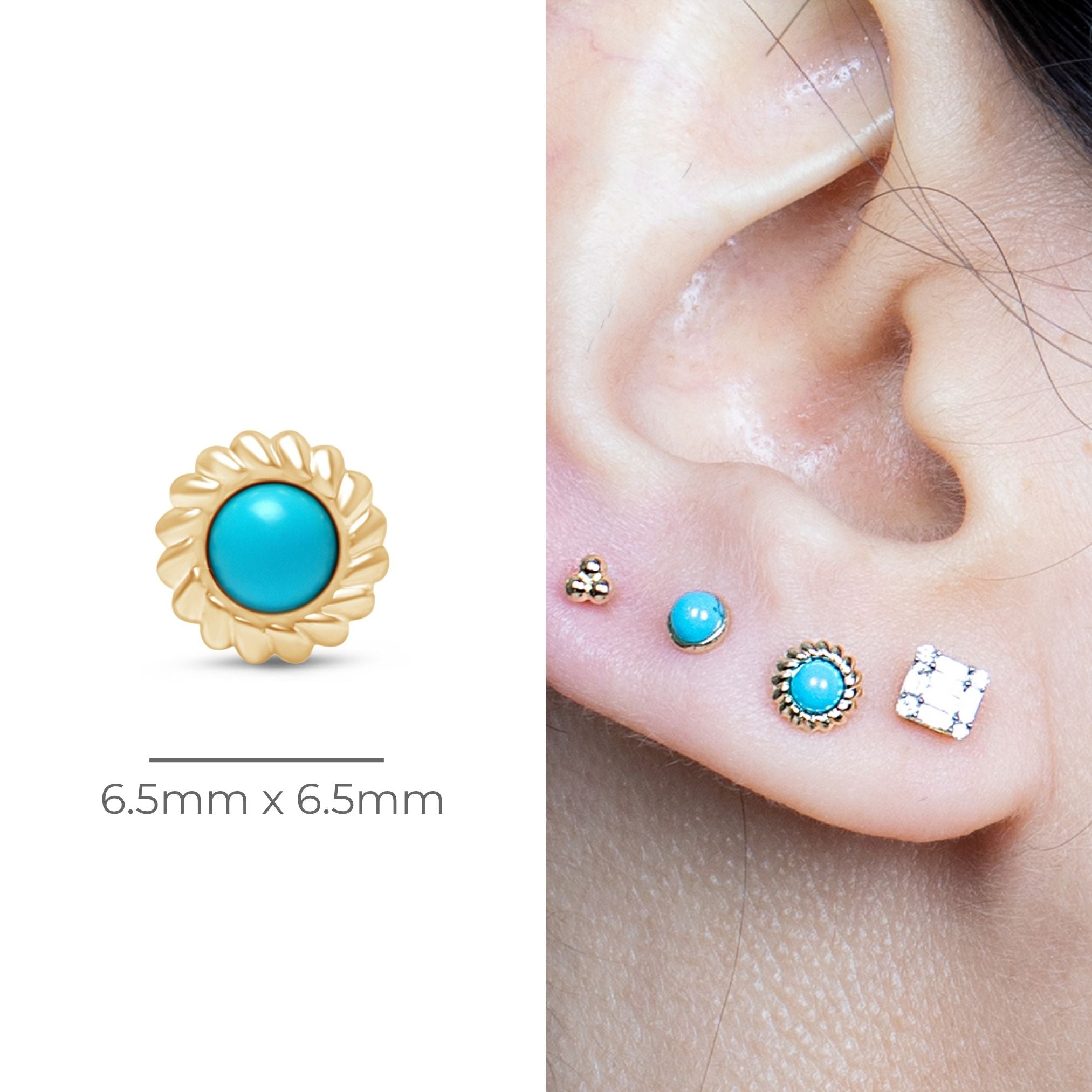 These created Turquoise studs add a vibrant pop of blue to your outfit. The beautiful braided gold detailing adds an elegant finishing touch. Crafted in brightly polished solid 14k gold, these lightweight and hypoallergenic flat-back earrings are perfect for everyday wear.