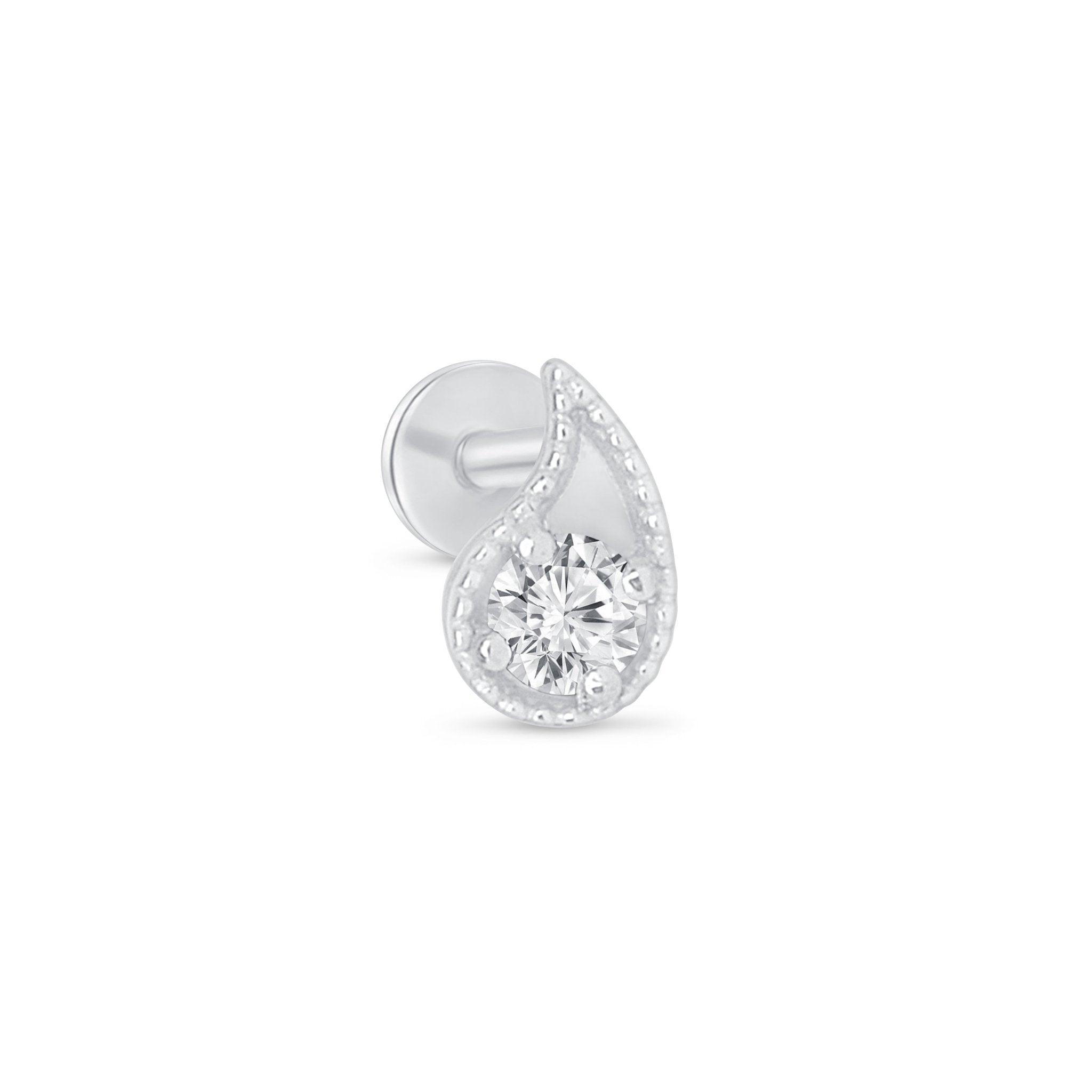 These adorable, high-quality 14k gold paisley diamond piercing stud earrings are perfect for your existing or freshest piercing and are super-cute for pairing and mixing with your other earrings, such as hoops and studs. These premium paisley piercing studs feature a sparkling diamond solitaire stone in the center, adding a pop of luxe sparkle every day you showcase your new style. Made in a bright polished finish, these hypoallergenic and lightweight piercing studs are suitable for all different occasions with their boho-chic presence. Miligrain edges of the paisley give these pretty diamond piercing studs an added detail that will not go unnoticed.