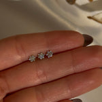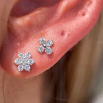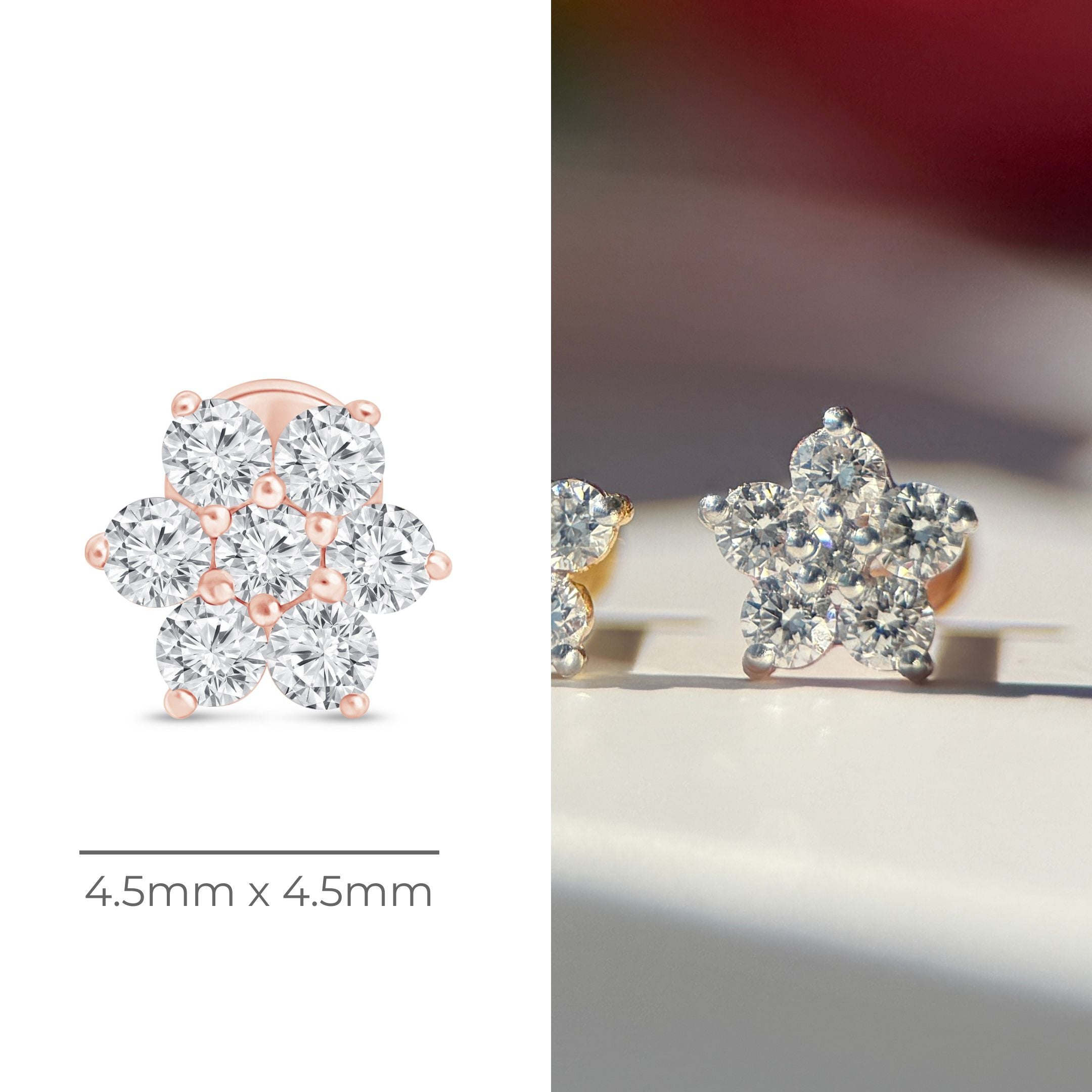 Radiating timeless elegance, these 14k rose gold diamond flower stud earrings feature a delicate cluster of round brilliant diamonds arranged in a blooming floral design. Lightweight, hypoallergenic, and comfortable, they are perfect for both newly pierced and healed ears. The bright polished finish and refined sparkle make them ideal for everyday wear or special occasions, whether worn solo or layered with other earrings.