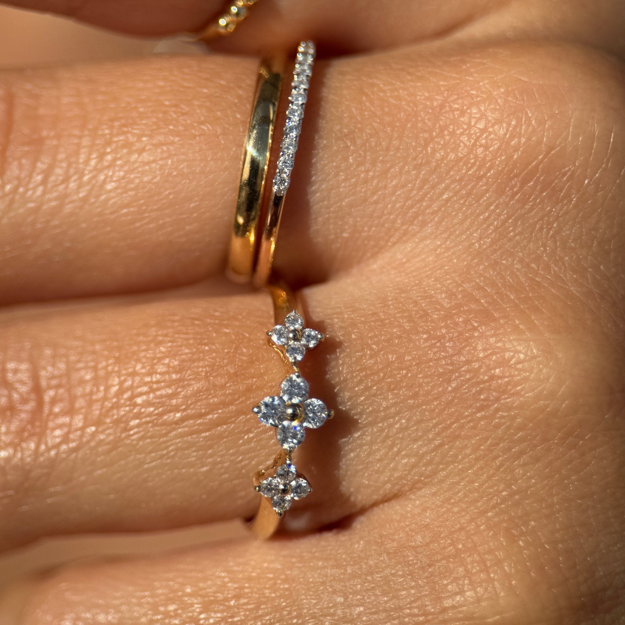 Three Flower Diamond Ring in Solid 14k Yellow Gold