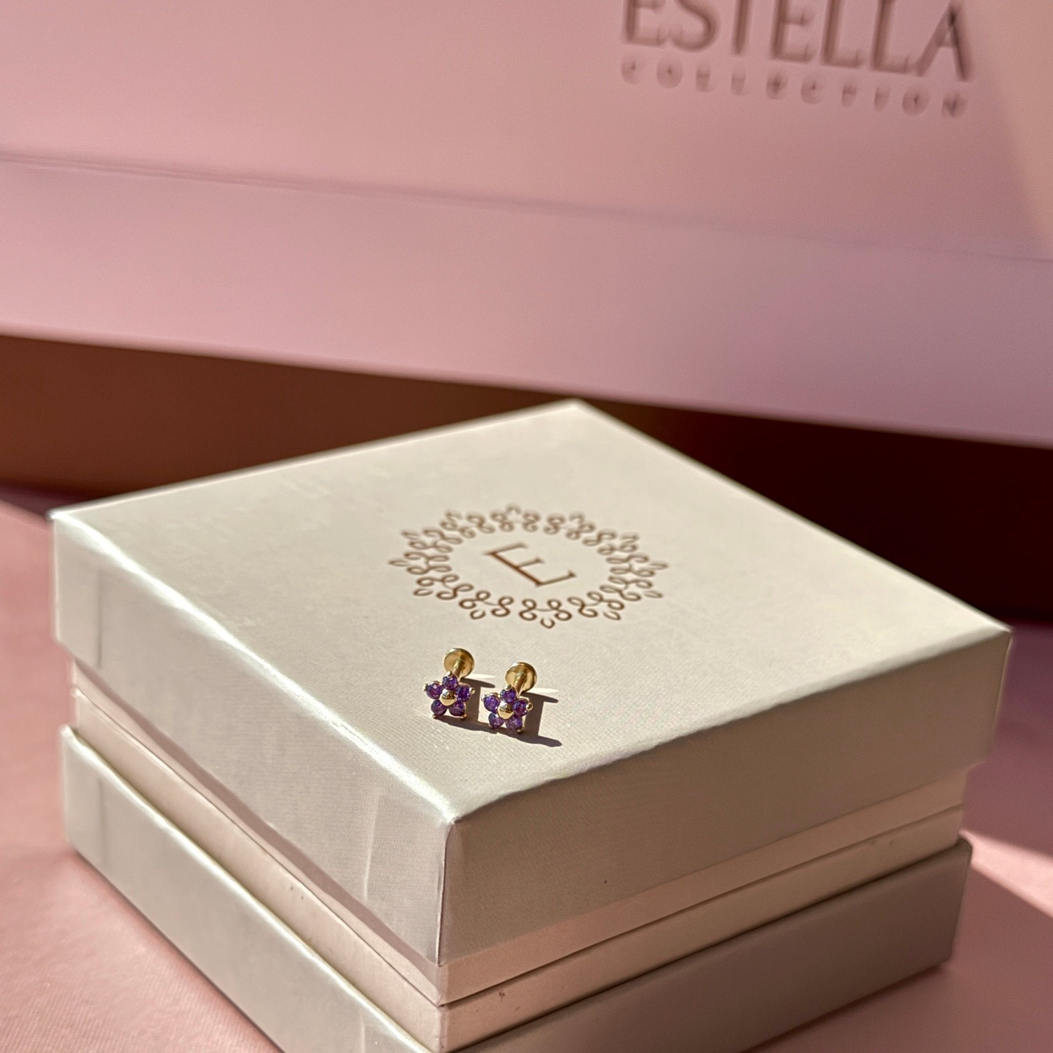 Amethyst Flower Flat Back Stud Earrings in Solid 14k Yellow Gold