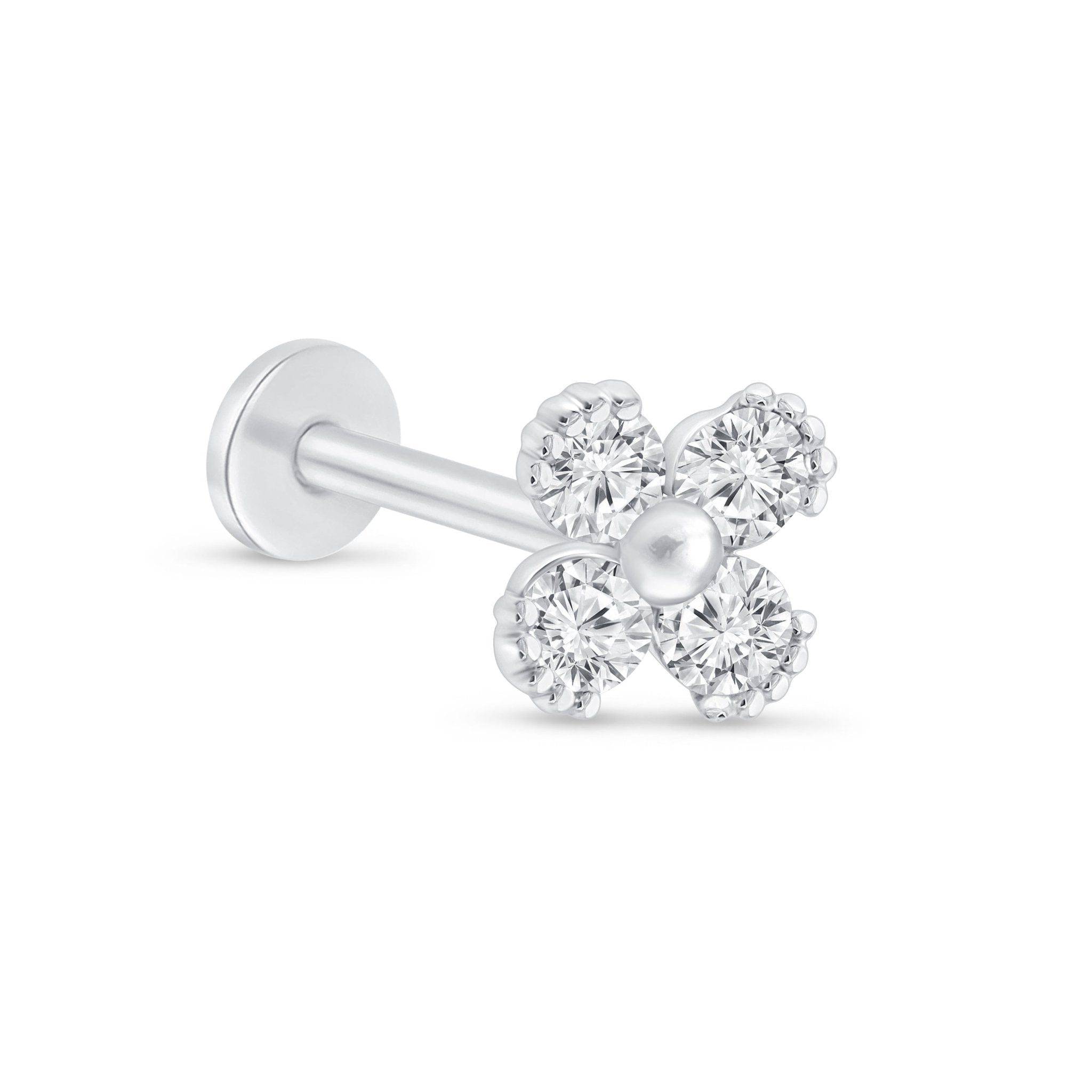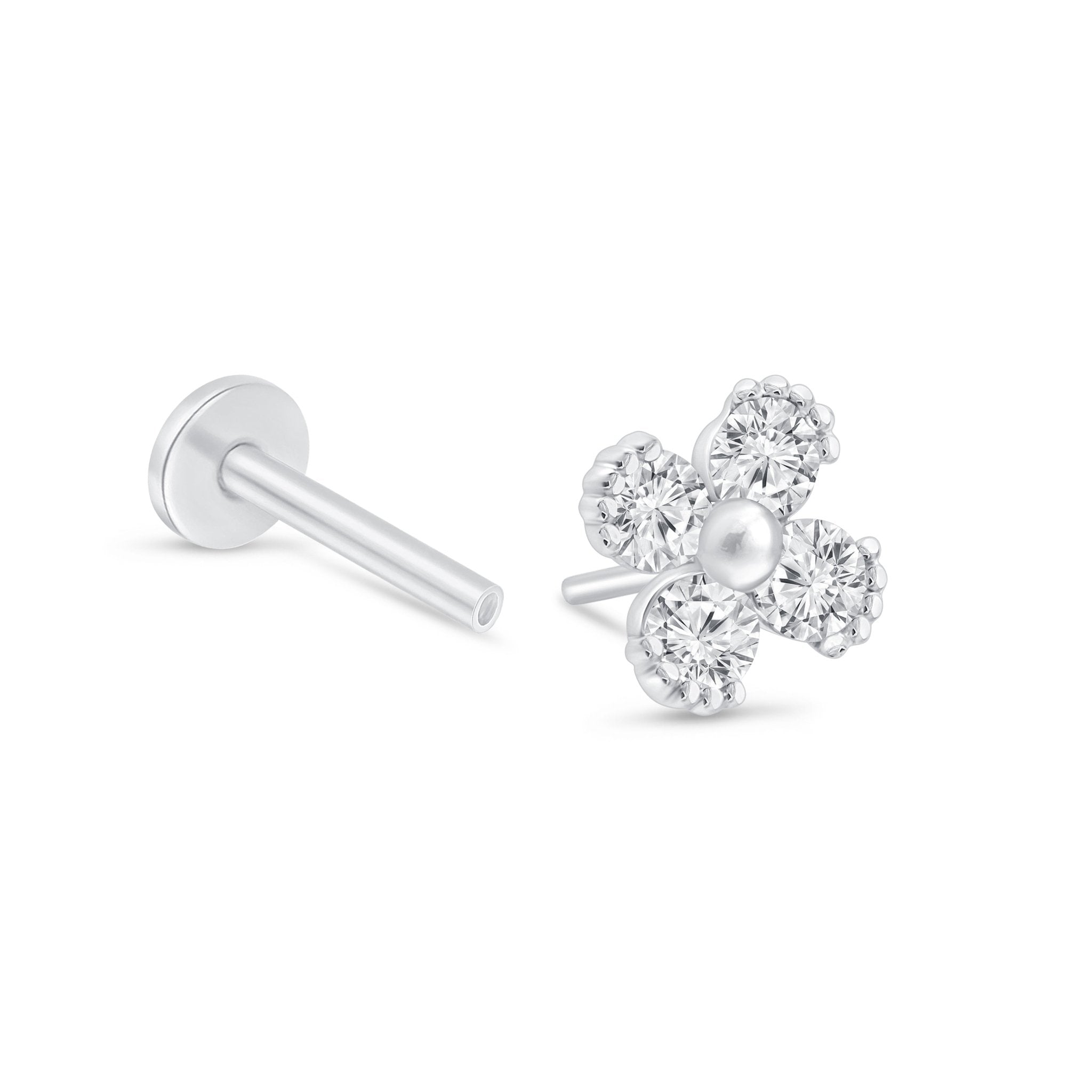 Beaded Four Petal Flower Diamond Flat Back Stud Earrings in Solid 14k White Gold