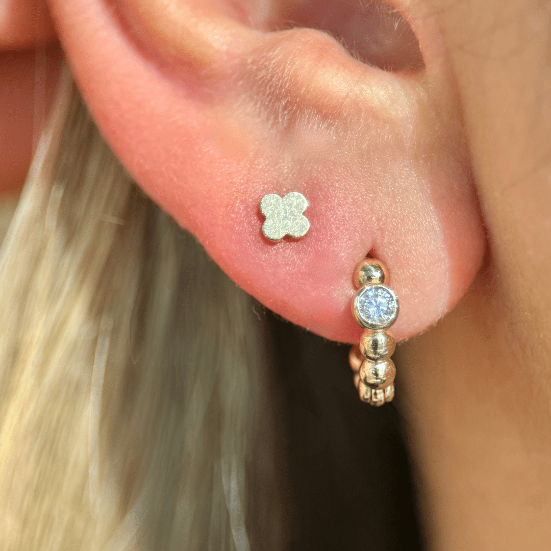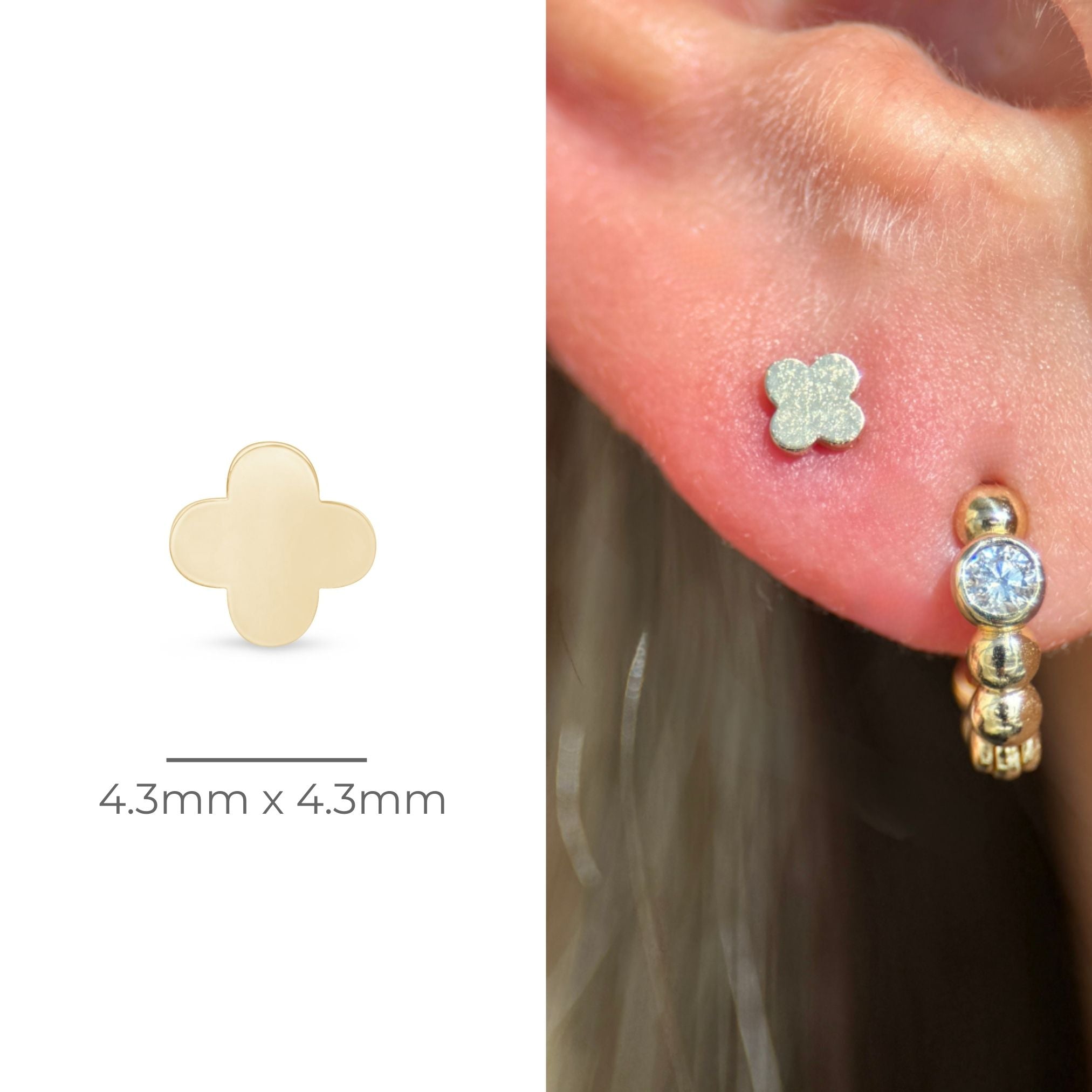 This 14k solid gold clover earring features a flat back and secure threaded post, designed for comfort in helix, tragus, cartilage, or lobe piercings. The small four-leaf clover shape adds a subtle symbol of luck to your everyday jewelry. Made from solid yellow gold, this 18G stud is lightweight, durable, and safe for sensitive skin. A simple and meaningful piece suitable for daily wear or gifting.