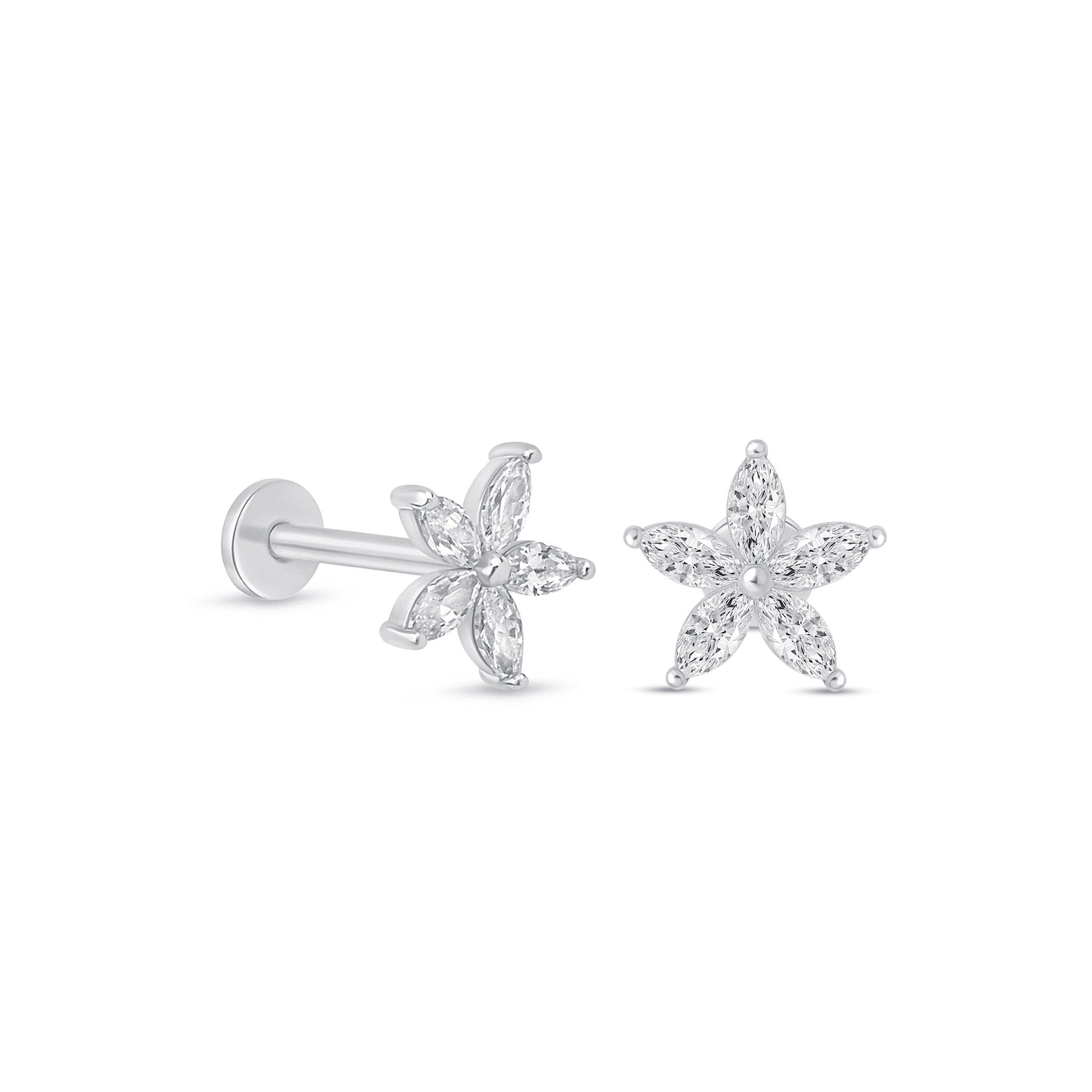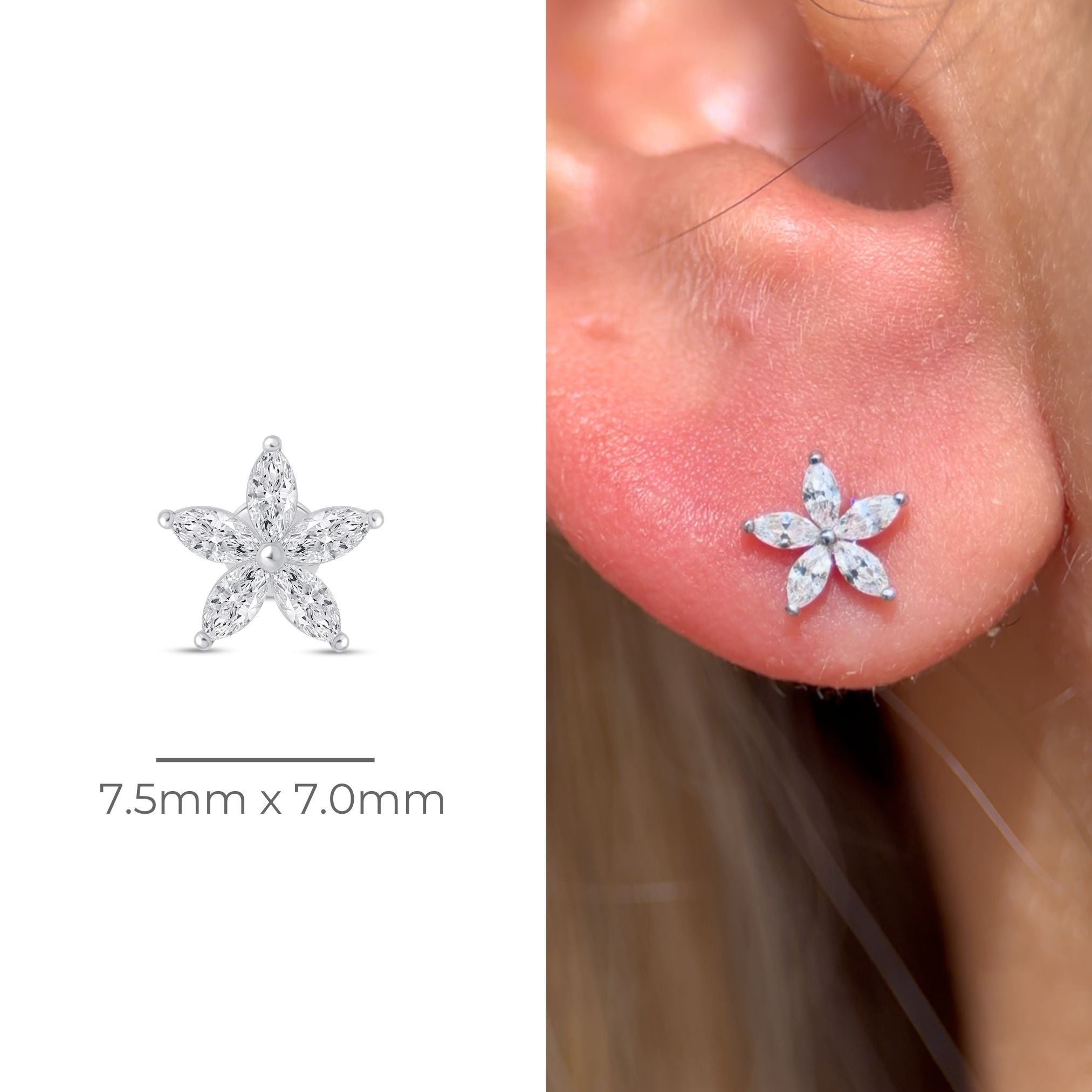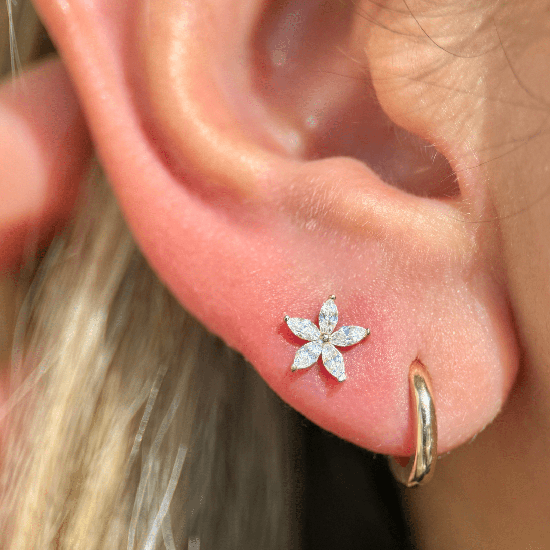 This 14k solid gold flower earring features five marquise-cut stones arranged in a floral shape. Designed with a flat back and threaded post, it offers a secure and comfortable fit for cartilage, helix, tragus, or lobe piercings. The floral design adds a soft sparkle, making it a simple yet elegant piece for daily wear. Made in yellow gold and suitable for sensitive ears.