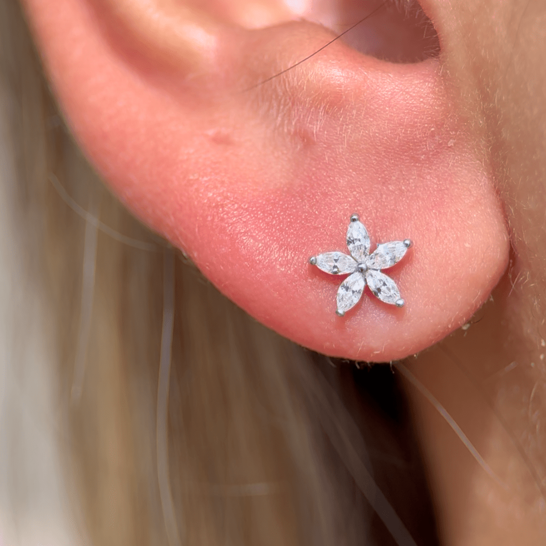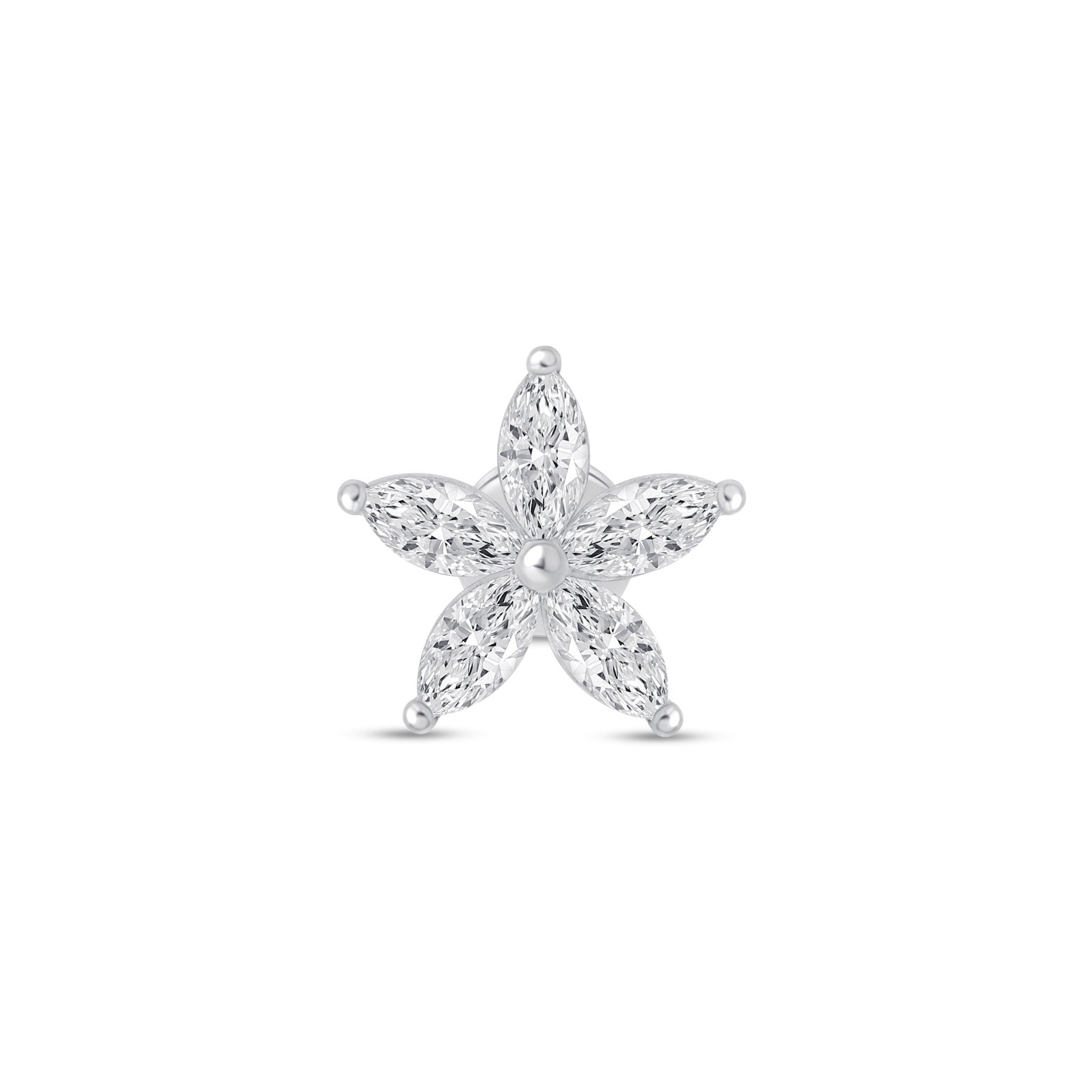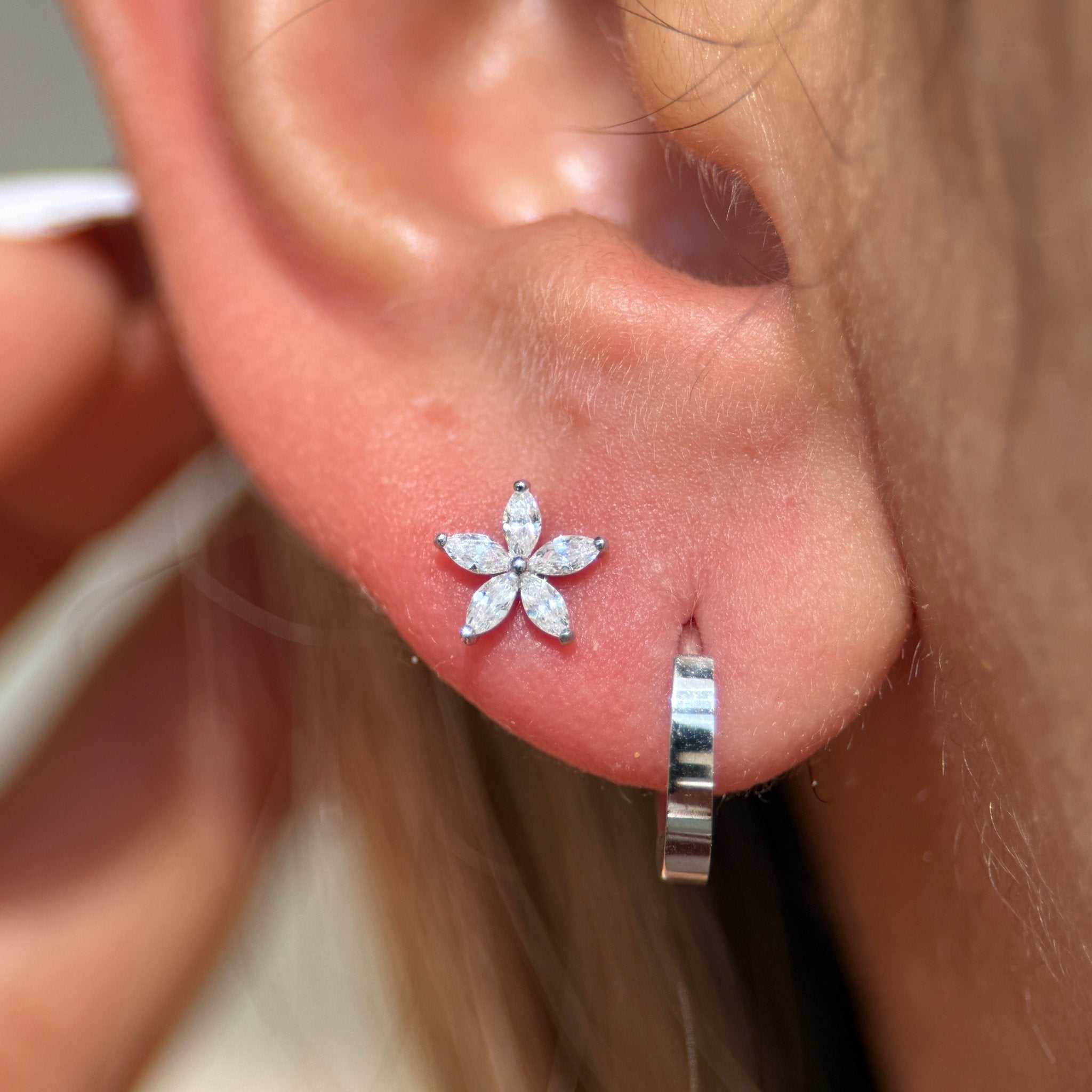 This 14k solid gold flower earring features five marquise-cut stones arranged in a floral shape. Designed with a flat back and threaded post, it offers a secure and comfortable fit for cartilage, helix, tragus, or lobe piercings. The floral design adds a soft sparkle, making it a simple yet elegant piece for daily wear. Made in yellow gold and suitable for sensitive ears.