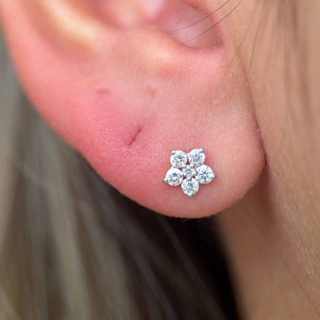 Six Round Diamond Flower Flat Back Stud Earrings in Solid 14k Rose Gold