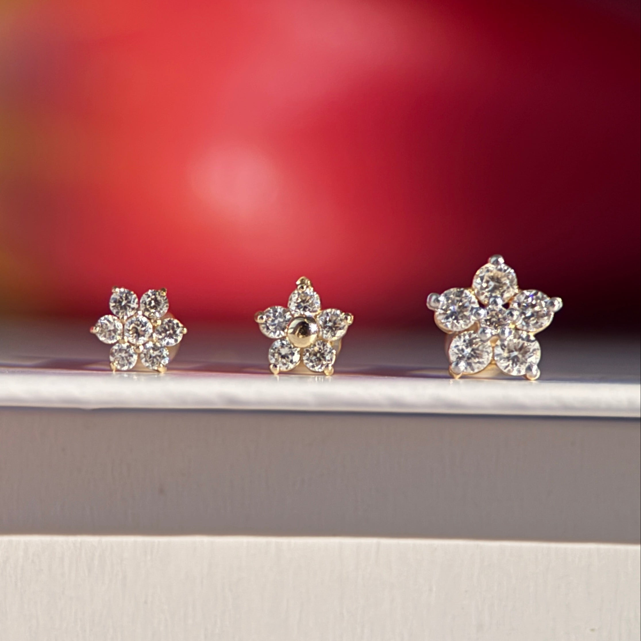 Make your occasion one to be remembered with these non-irritating, hypoallergenic piercing earrings made for piercings! Accentuate your wardrobe with this pair of high-quality, lightweight 14k gold flower stud earrings that are reminiscent of nature’s beauty with a boho-chic vibe. Designed in a bright polished finish, these petite gold studs feature sparkling diamonds artfully prong set and beautifully arranged in a blooming flower shape. Mix and match these personalized stone studs with other earrings for a highly accessorized look or wear them solo. These diamond studs are perfect for frequent wear and all occasions. Diamond gold studs are classic in style, lending a timelessness to any outfit.