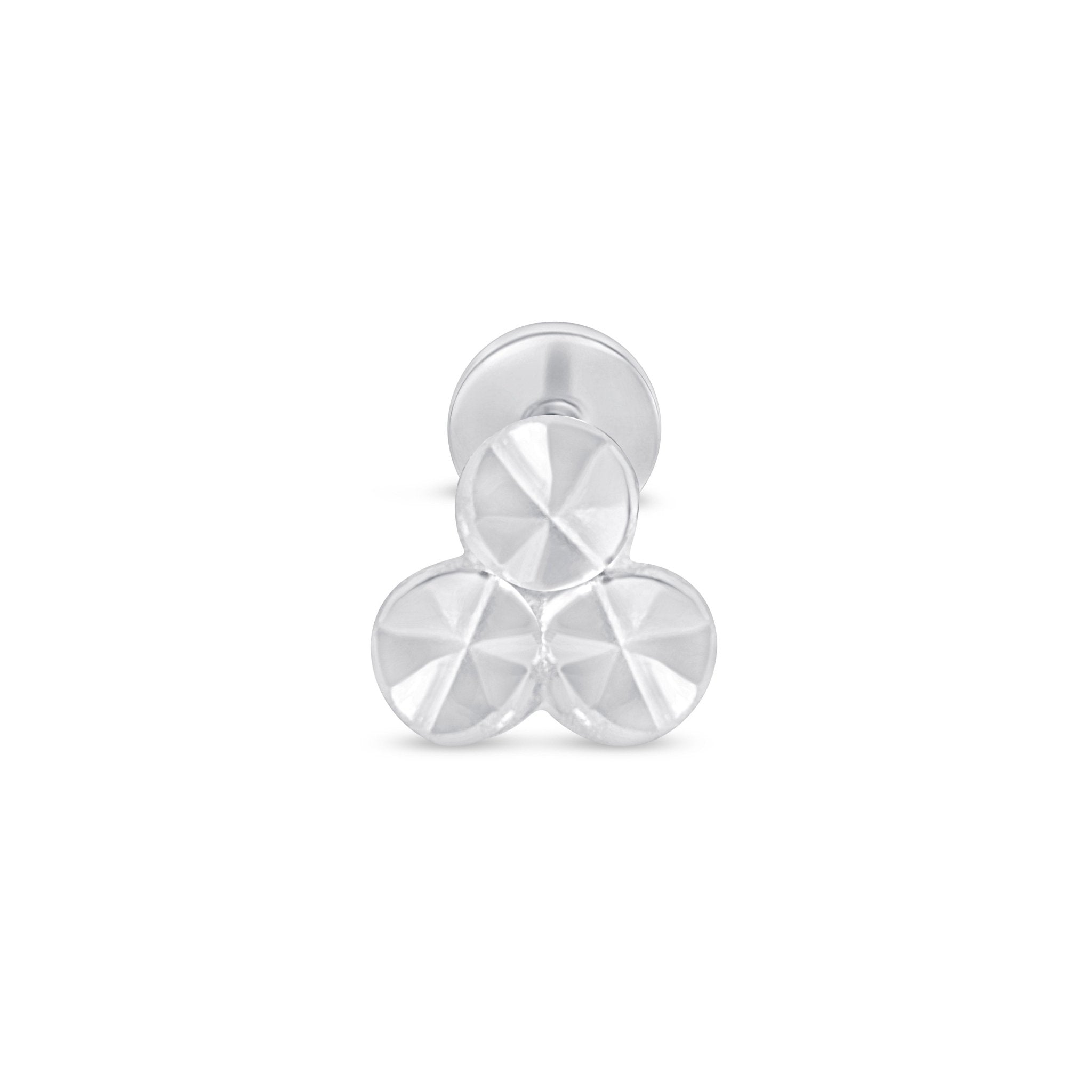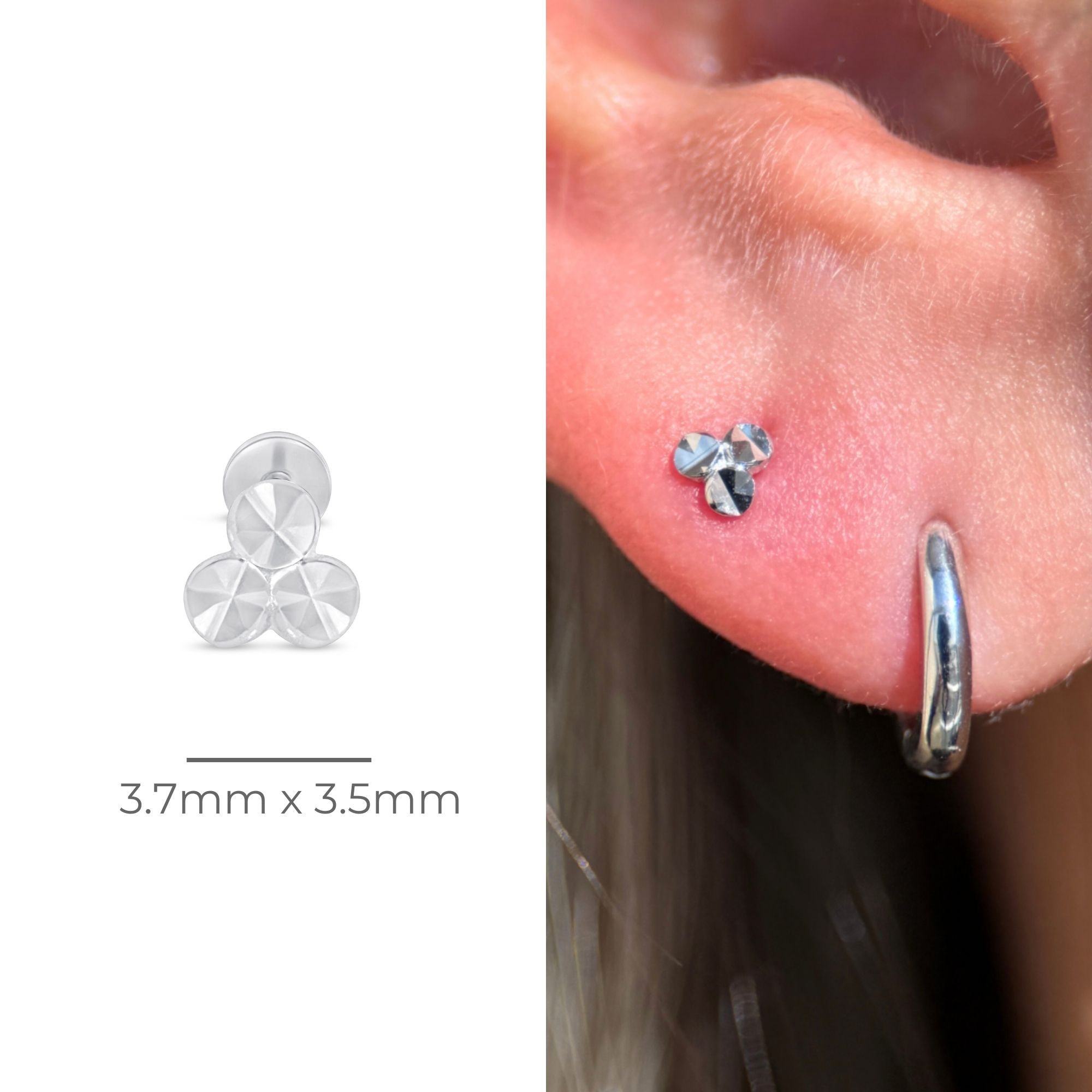 This 14k solid gold trio earring features three small domes with a diamond-cut texture that adds soft shine without using stones. The flat back and 18G threaded post provide a secure and comfortable fit, ideal for cartilage, helix, tragus, or lobe piercings. Lightweight and simple, this stud works well in second or third piercings and is easy to wear all day or night. A subtle option for everyday stacking and minimal style.