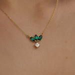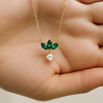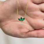 Emerald Marquise Flower & Princess Cut White Sapphire Dangle Necklace in Solid 10k Yellow Gold