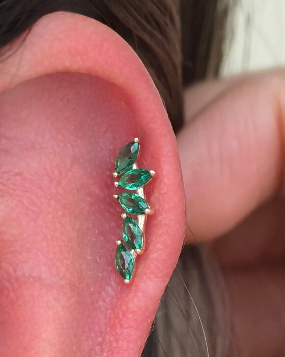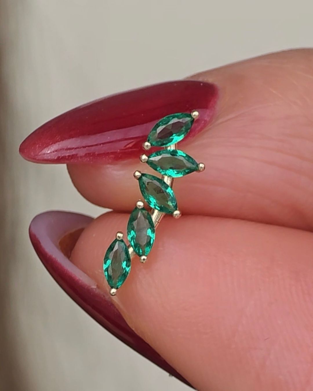 Elegant and modern, select these high-quality, hypoallergenic 14k gold piercing emerald ear climber stud earrings that are suitable for those who desire a contemporary style for their freshest ear piercing. Designed in a bright polished finish, these lightweight angel wing ear climber stud feature marquise cut green emerald that is prong set, adding a super-luxe appeal and wearability for your newest ear piercing, so you won't snag or catch them on clothing. Perfect for pairing with hoops and other studs on neighboring ear holes. Made to be non-irritating and soft on the skin. Perfect for everyday wear!