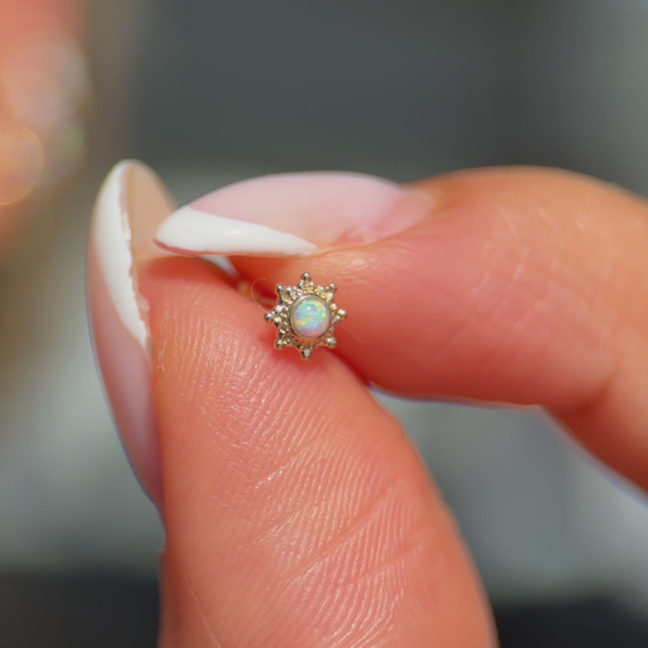 Brighten your ear stack with this 14K gold sunburst opal flat back stud. The radiant opal center is surrounded by a delicate sunburst design, adding a touch of luminous elegance to any piercing.
