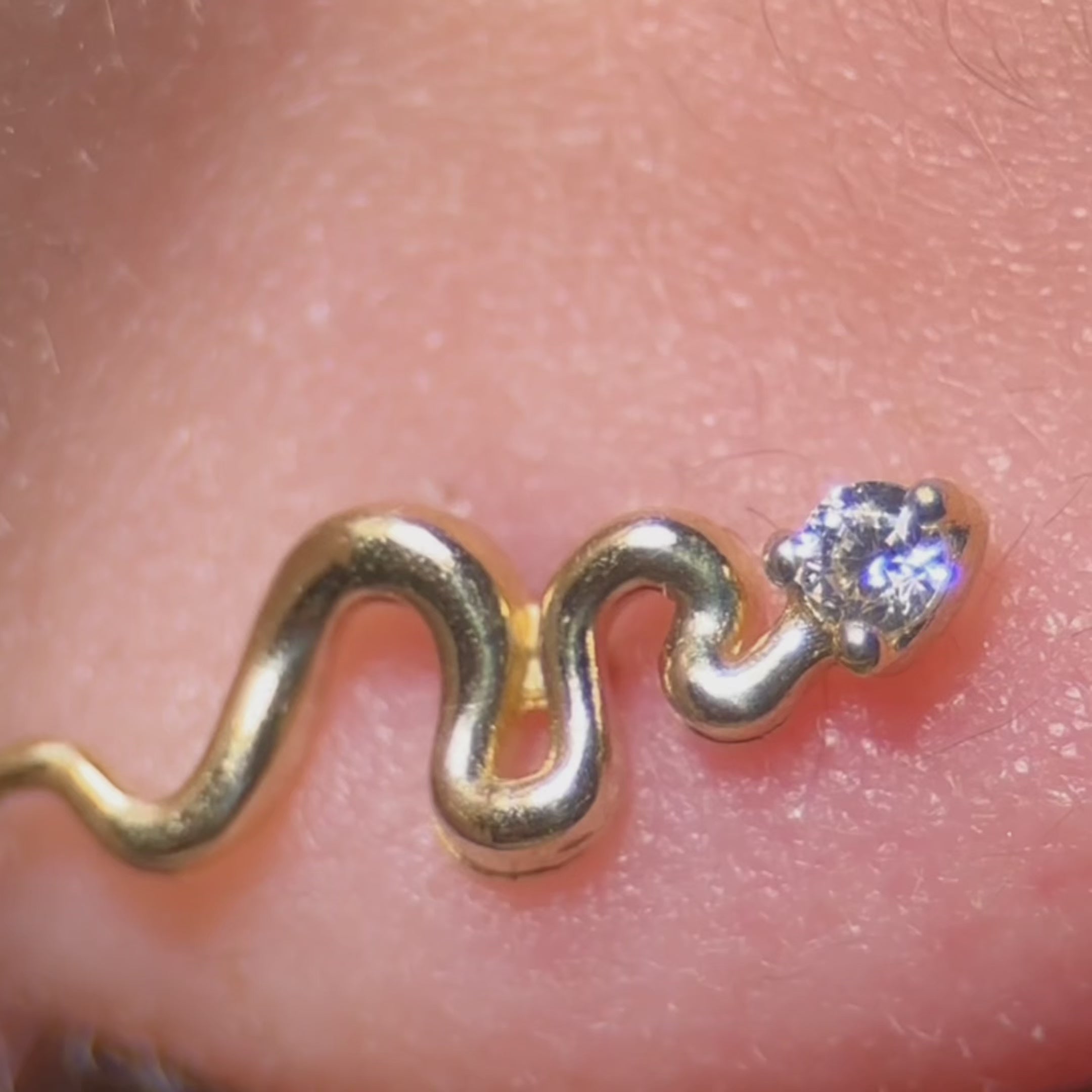These high-quality 14k yellow gold hypoallergenic piercing snake studs are perfect for those who want a modern look for their freshest piercing. Designed in a bright polished finish, these lightweight, premium quality studs feature sparkling cubic zirconia is bezel set, adding a bit of sparkle with luxe appeal to your existing or new ear piercing. Perfect for pairing with hoops and other studs on neighboring ear holes.
