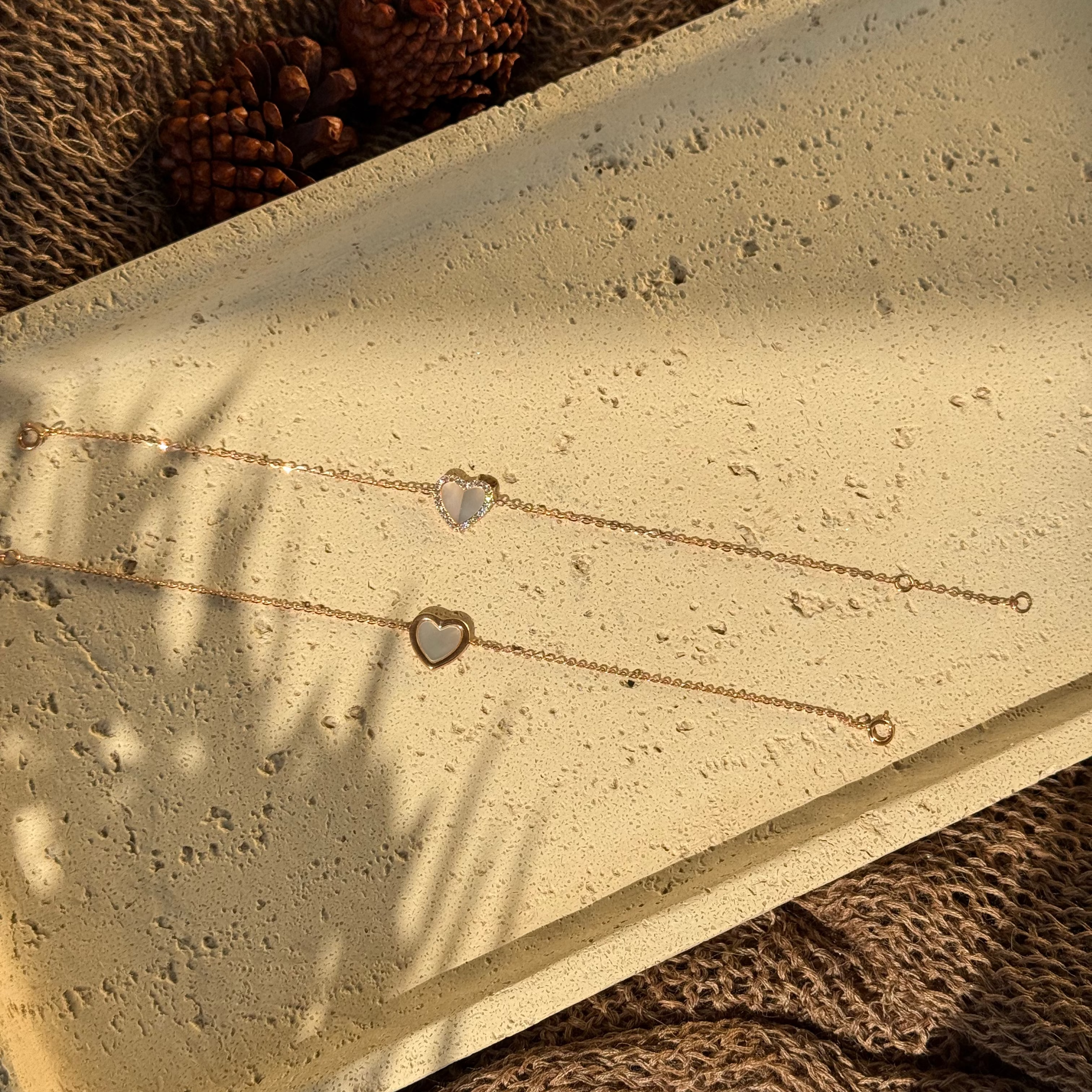 Heart shape station chain bracelet In rose gold, mother of pearl and diamonds. Perfect gift for women you love. This Bracelet comes with two closing options, one to get a snug look and the other will loosely dangle on your hand.