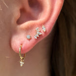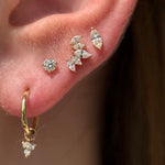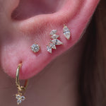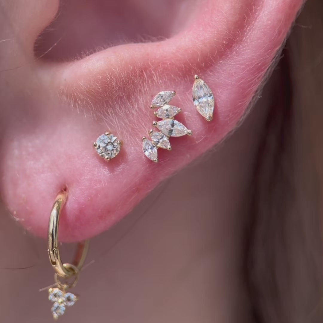 Sparkling with marquise cut cubic zirconia, these petite white stone high-quality 14k gold studs are the perfect accessory that will add a touch of feminine chic to any wardrobe. Make your brand-new piercing occasion unique with these trendy piercing studs that are hypoallergenic and non-irritating to the skin. Lightweight and beautiful, these studs are gracefully arranged into five leaf fans, giving them a nature-inspired style that will not go unnoticed. These small gold studs are the perfect accessory for day or night wear, lending an elegant versatility that is perfect for your life. Trendy and perfect for wearing with multi-earrings, if desired.