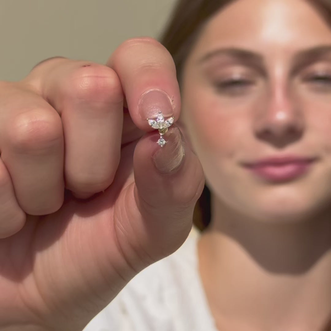 Add a touch of elegance with our 14k gold three marquise flower dangle flat back earring. Designed with three shimmering marquise-cut stones forming a delicate floral shape, and a sparkling dangle for added charm. Perfect for cartilage, helix, and tragus piercings. Crafted in solid gold for lasting beauty and comfort.