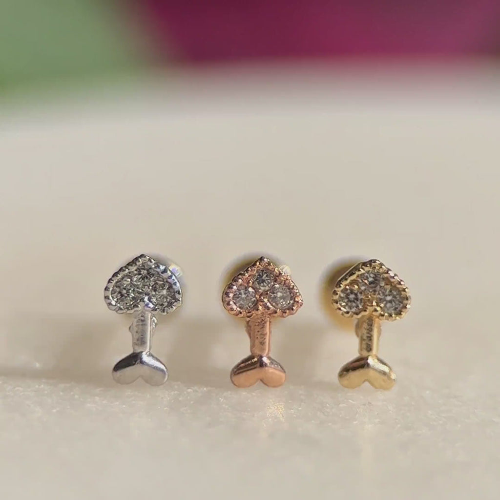 Diamond Heart Cupid's Arrow Flat Back Stud Earrings in Solid 14k White Gold
