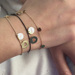 Playful charm bracelet in solid yellow gold mounted on a beige or black tassel. This youthful design is a perfect gift to yourself or the girlfriend that you love. The bracelet is adjustable according to the desired width.