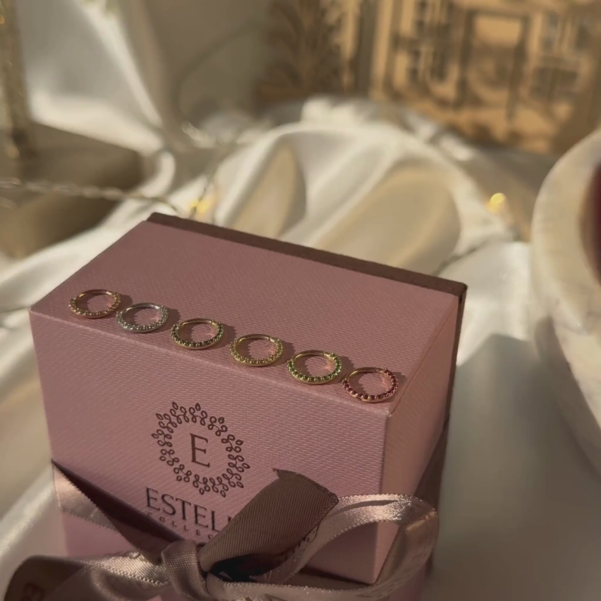 a pink box with three rings inside of it