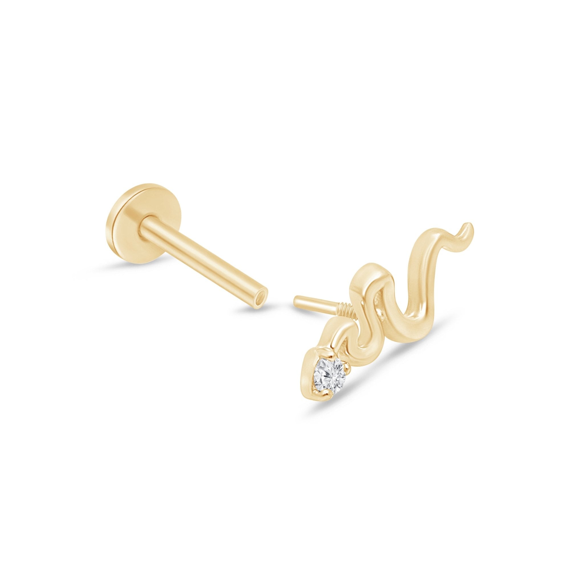 These high-quality 14k yellow gold hypoallergenic piercing snake studs are perfect for those who want a modern look for their freshest piercing. Designed in a bright polished finish, these lightweight, premium quality studs feature sparkling cubic zirconia is bezel set, adding a bit of sparkle with luxe appeal to your existing or new ear piercing. Perfect for pairing with hoops and other studs on neighboring ear holes.
