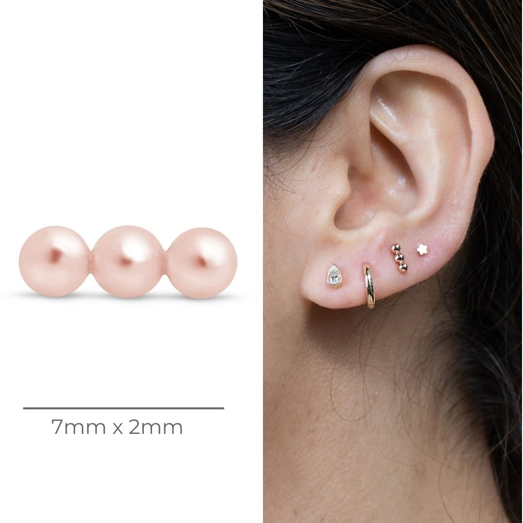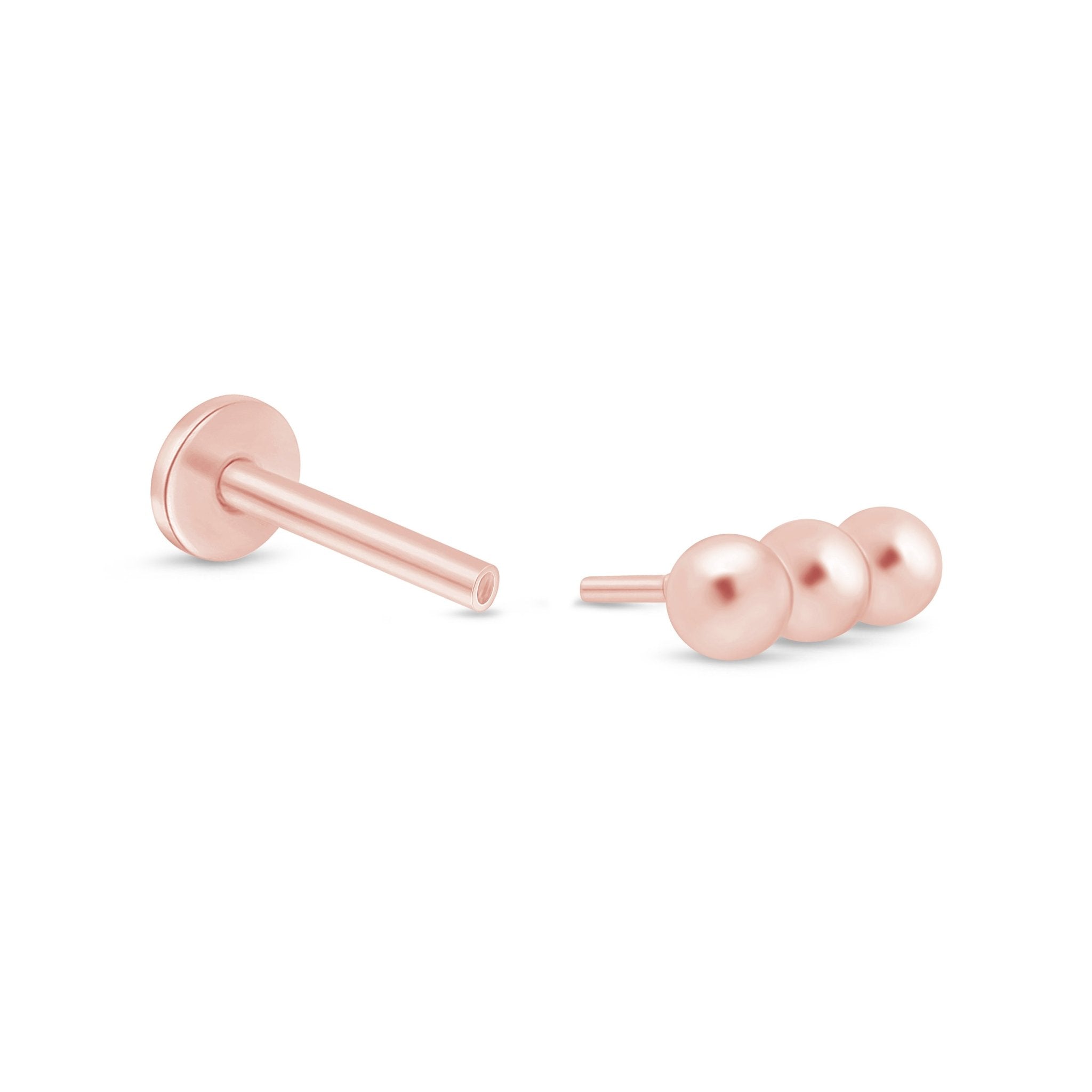 Three Bead Bar Flat Back Stud Earrings in Solid 14k Rose Gold