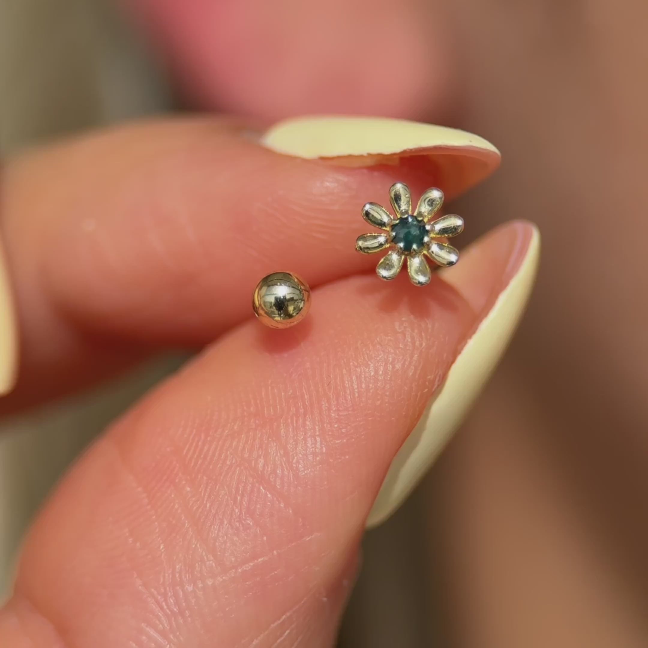 A delightful, colorful flower is set on one side of this high-quality 14k gold 1mm open curved piercing, adding a pop of eye-catching color with a hand-set rough dark blue diamond. The other side of the hoop has a screw off-ball that makes it easy to place on and remove from the ears. Show off your piercings with this rough blue diamond 1mm gold hoop that will add a touch of luxurious style to your highly accessorized look. Stay on trend with this hypoallergenic, non-irritating, premium piercing ring that is the ultimate choice in trendy earrings.