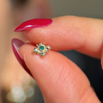 This bumblebee stud is created in a bright 14k gold, and glistens with a sparkling created Emerald in the center, adding a touch of color and personality.