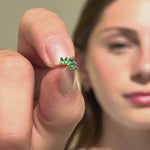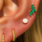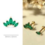 Sparkling with marquise cut emerald, these petite green stone high-quality 14k gold studs are the perfect accessory that will add a touch of feminine chic to any wardrobe. Make your brand-new piercing occasion unique with these trendy piercing studs that are hypoallergenic and non-irritating to the skin. Lightweight and beautiful, these studs are gracefully arranged into five leaf fans, giving them a nature-inspired style that will not go unnoticed. These small gold studs are the perfect accessory for day or night wear, lending an elegant versatility that is perfect for your life. Trendy and perfect for wearing with multi-earrings, if desired.