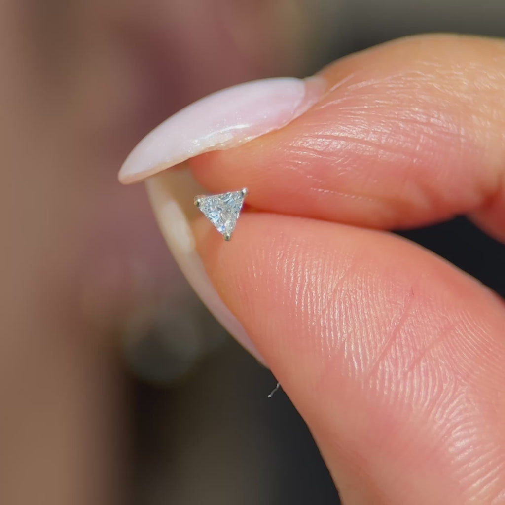 These classic triangle studs are a unique addition to your ear stack. Expertly handset in 14k solid yellow or white gold, these comfortable and hypoallergenic flat back earrings are perfect for everyday wear.