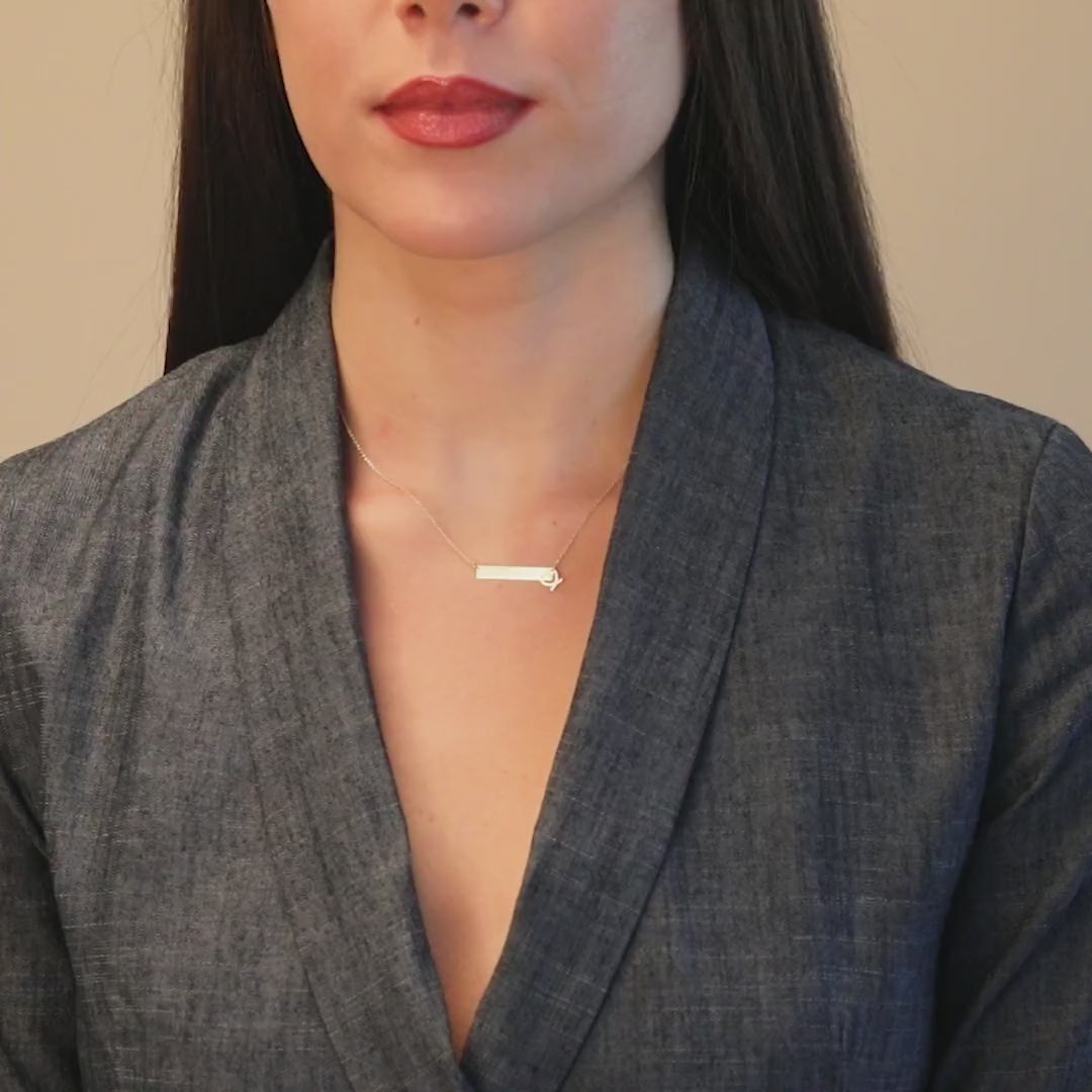 Personalize your fine jewelry with this bar pendant necklace. This nameplate necklace is designed to fit in with your everyday outfits. We can laser inscribe any initials to make this an extremely personal gift. It is versatile enough to be worn on its own or paired with one of our other necklaces. The chain is adjustable to be 16" or 14" in length.
