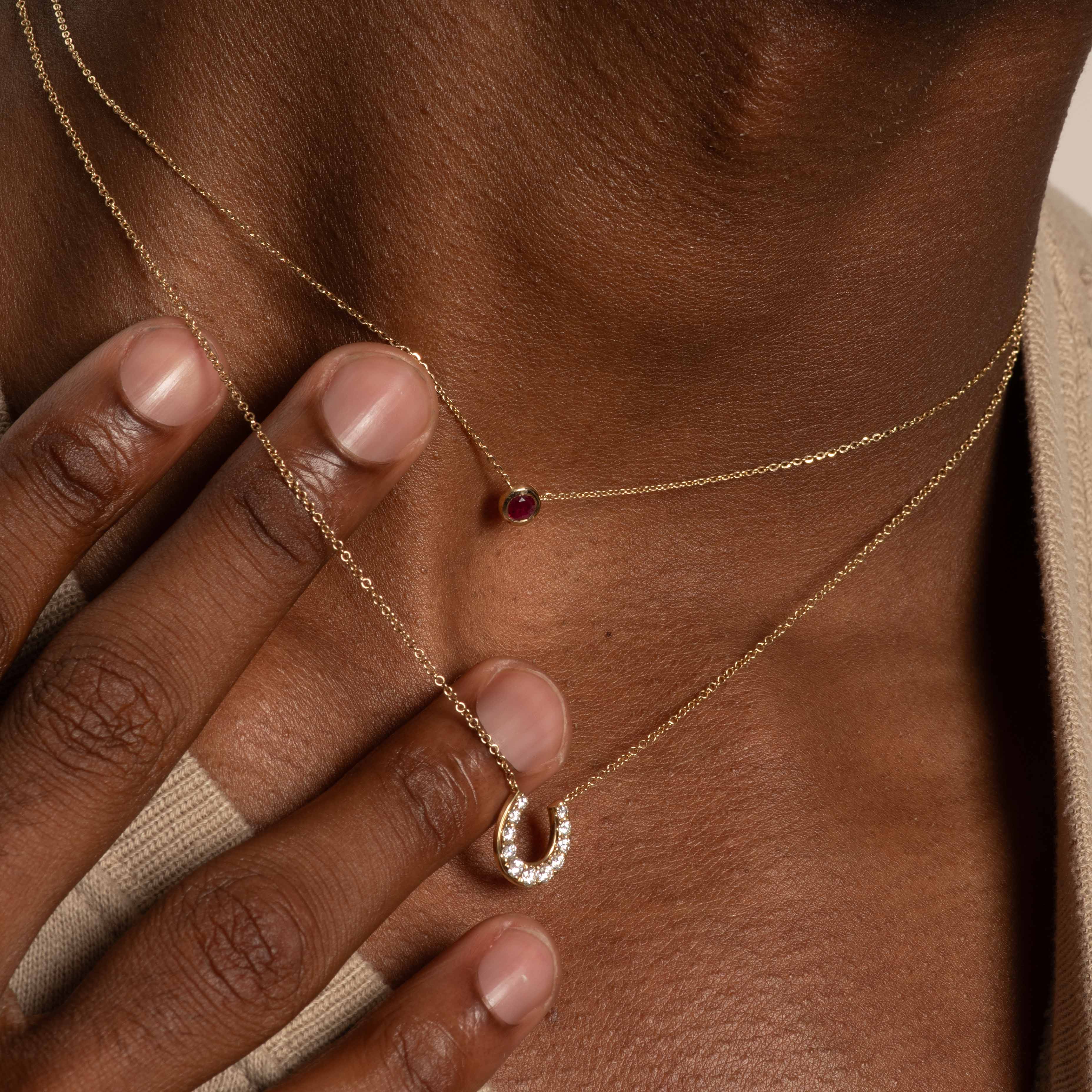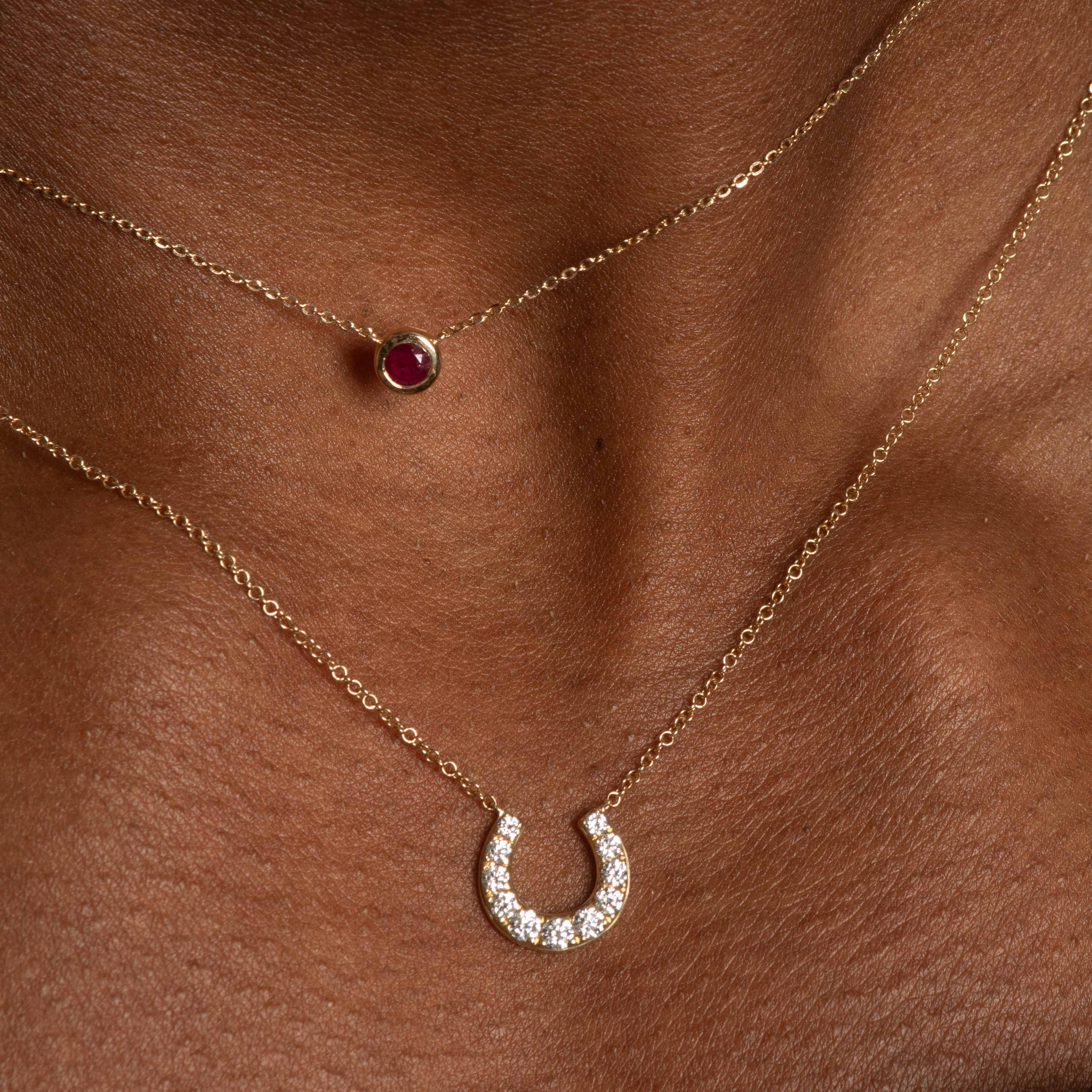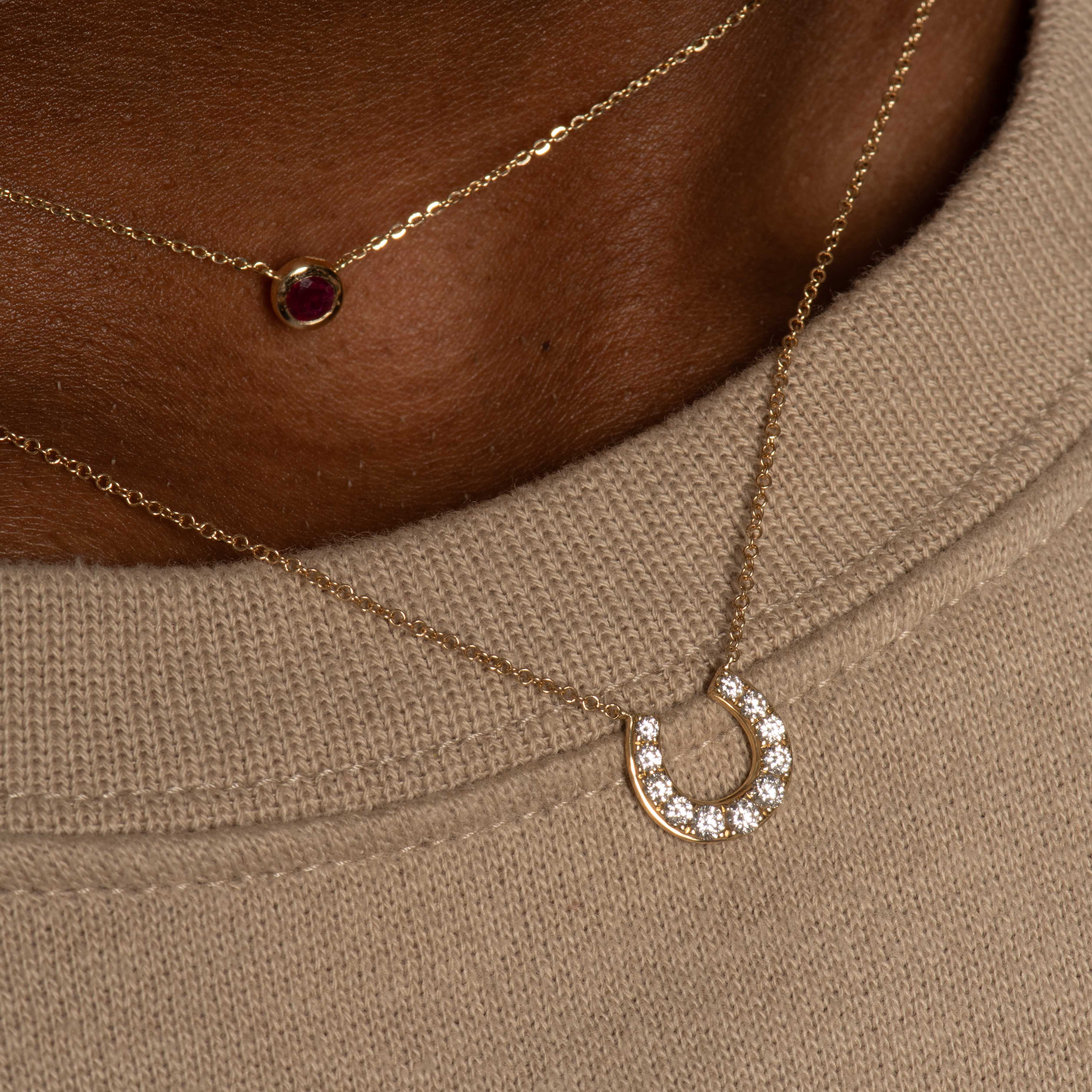 Horseshoes symbolize luck, fortune, and blessings, which makes this gorgeous horseshoe pendant layer necklace a great gift to give to yourself or someone special in mind. Created in brightly polished 14k gold-this necklace is adorned with sparkling round brilliant cut diamonds on the front and is perfect for layering with other necklaces if desired. This diamond-encrusted pendant is center-set in a delicate cable link chain that will lay gracefully along the collarbone when worn. Shop our full collection and complete your look.
