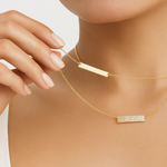 Personalize your fine jewelry with this bar pendant necklace. This nameplate necklace is designed to fit in with your everyday outfits. We can laser inscribe any initials to make this an extremely personal gift. It is versatile enough to be worn on its own or paired with one of our other necklaces. The chain is adjustable to be 16" or 14" in length.